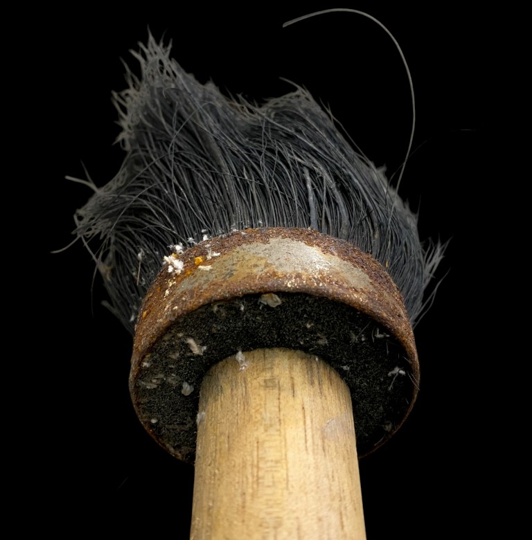 Wooden handle, black bristles. Good condition.