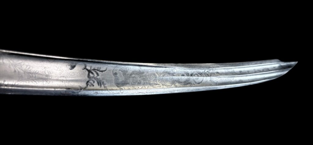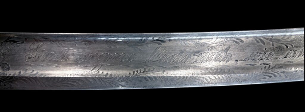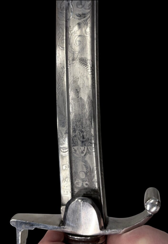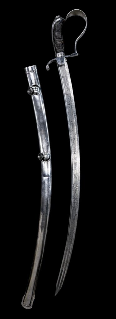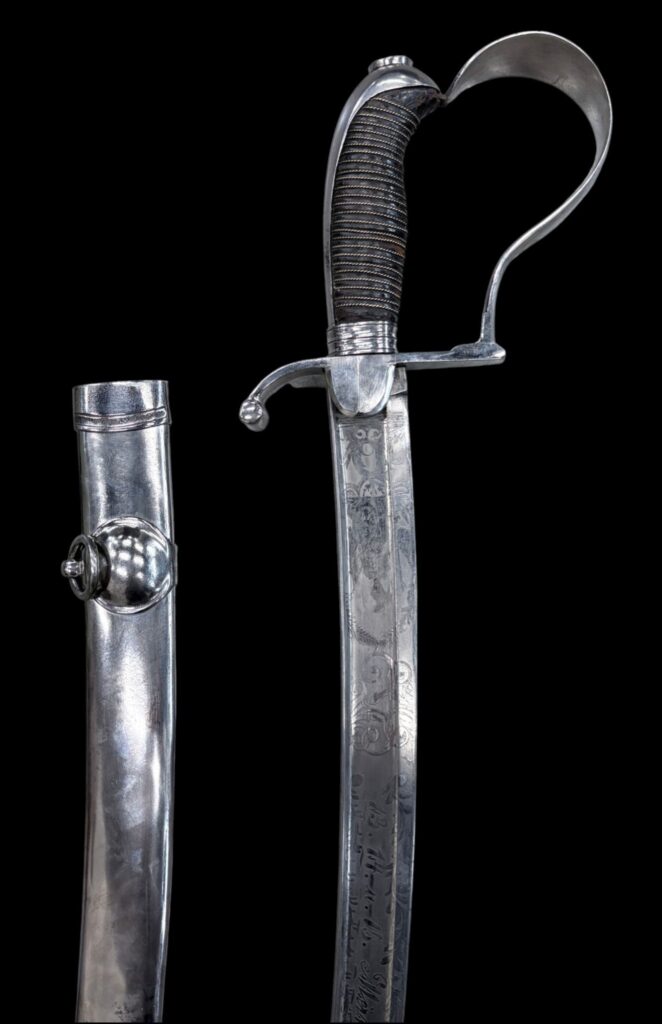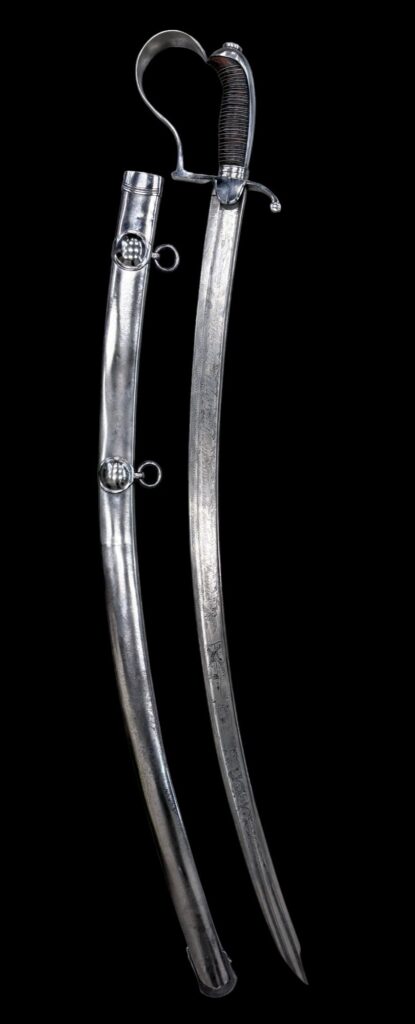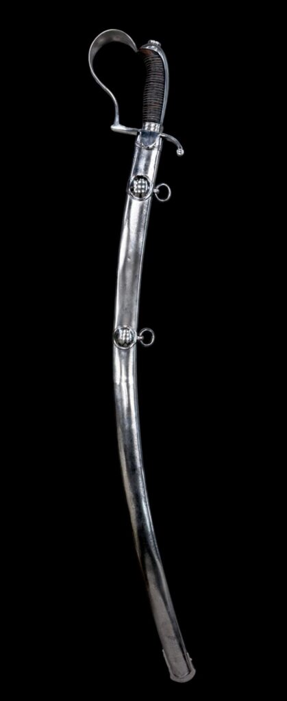 1837–1848 közötti. Polírozott acél hüvelyén szabvány szerinti pogácsás felkötőkkel. S alakú kézvédővel, bőrözött markolatán réz sodronnyal.