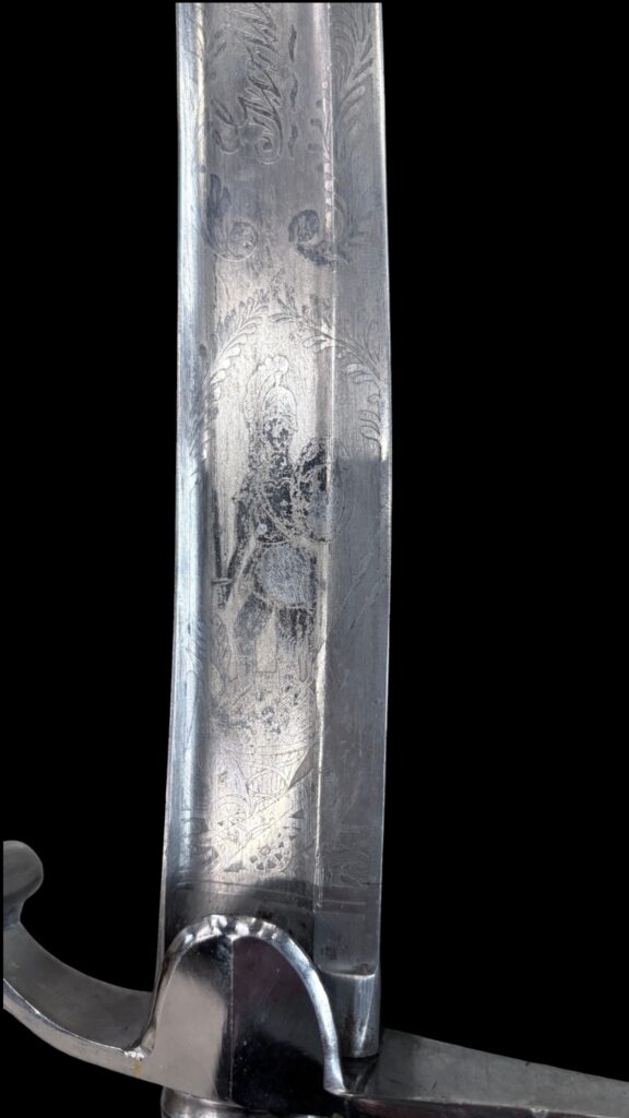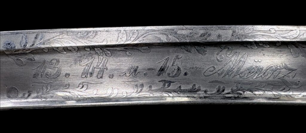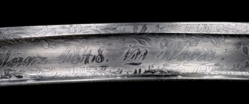 Pengéje: Pandúr-hegyes, két vájatú, extra penge, teljes hosszában savmaratott és vésett díszítéssel. Egyik oldalán stilizált római katona, pajzsán „F1” jelzéssel. Ornamentális keretben kurrent írással felirat az 1848. március 13–15-i bécsi forradalomra utalva. Másik oldalon római harcos pajzsában osztrák kétfejű sas, valamint „Johann Michner” név vagy készítői jelzés. Nagyon kvalitásos munka. Kitűnő állapotban.