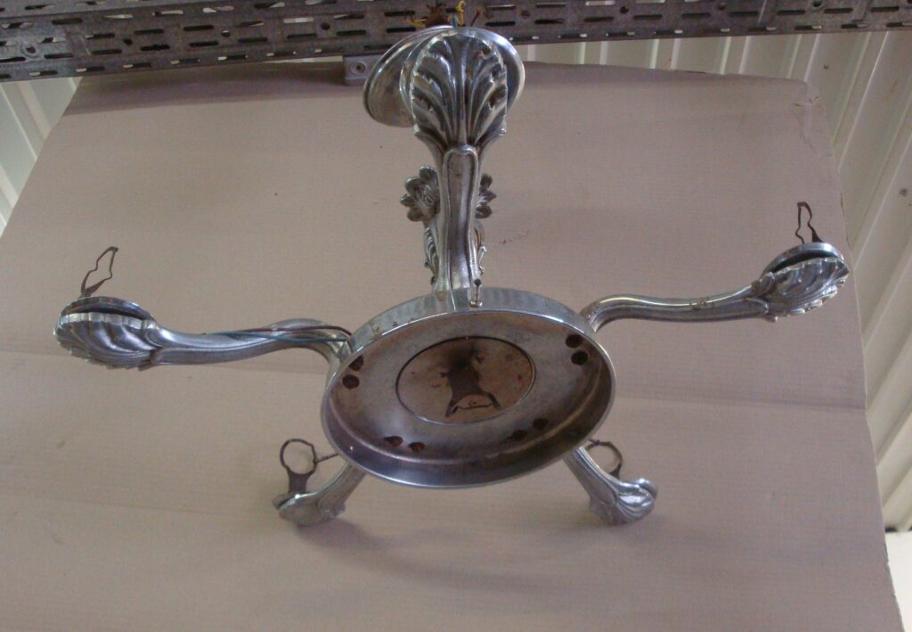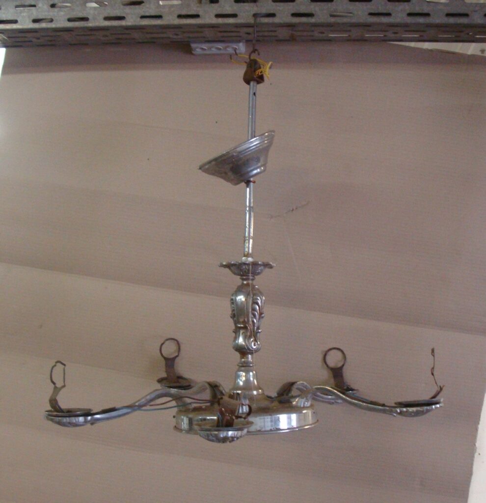 Art-deco csillár: 1920-40 közötti. Nikkelezett felülettel, búrák nélkül, eredeti, fellelt állapotban. Méret: 58 cm magas, d=55 cm