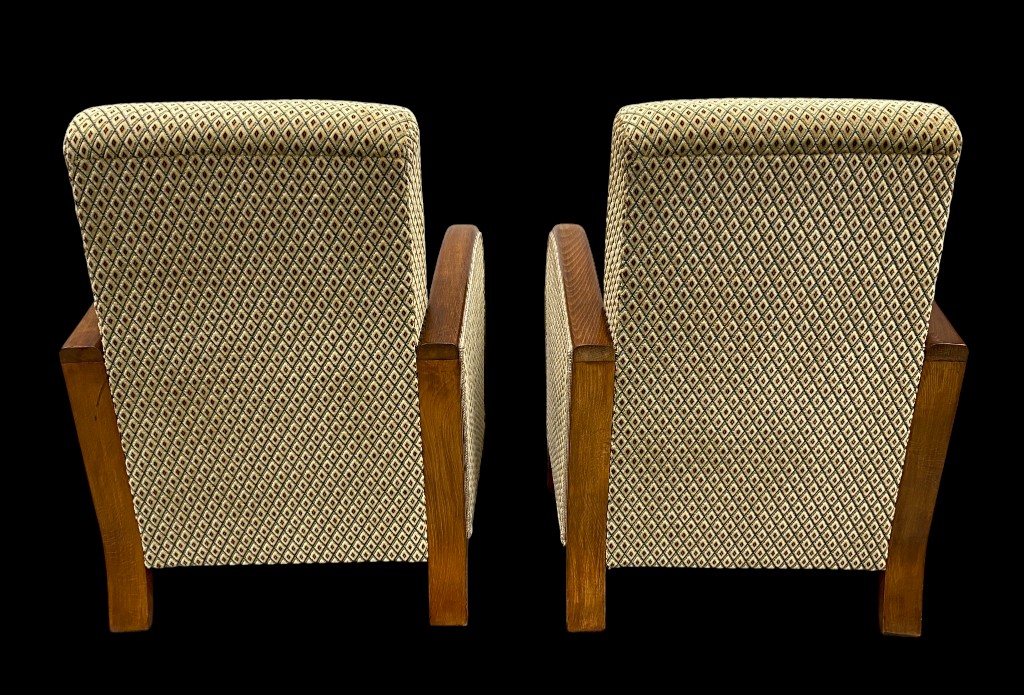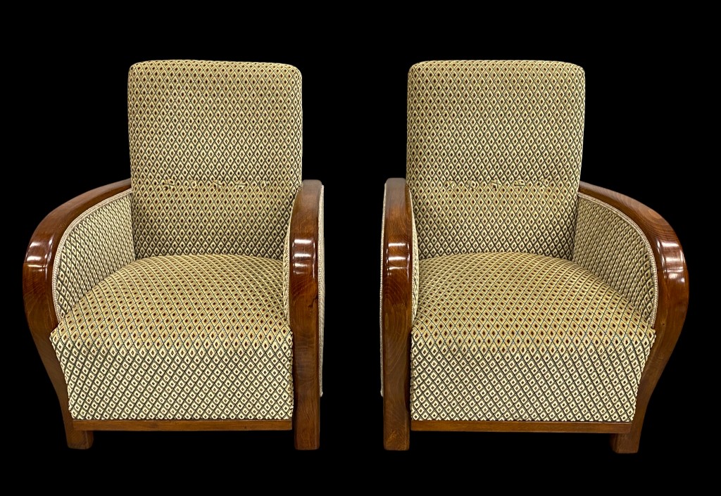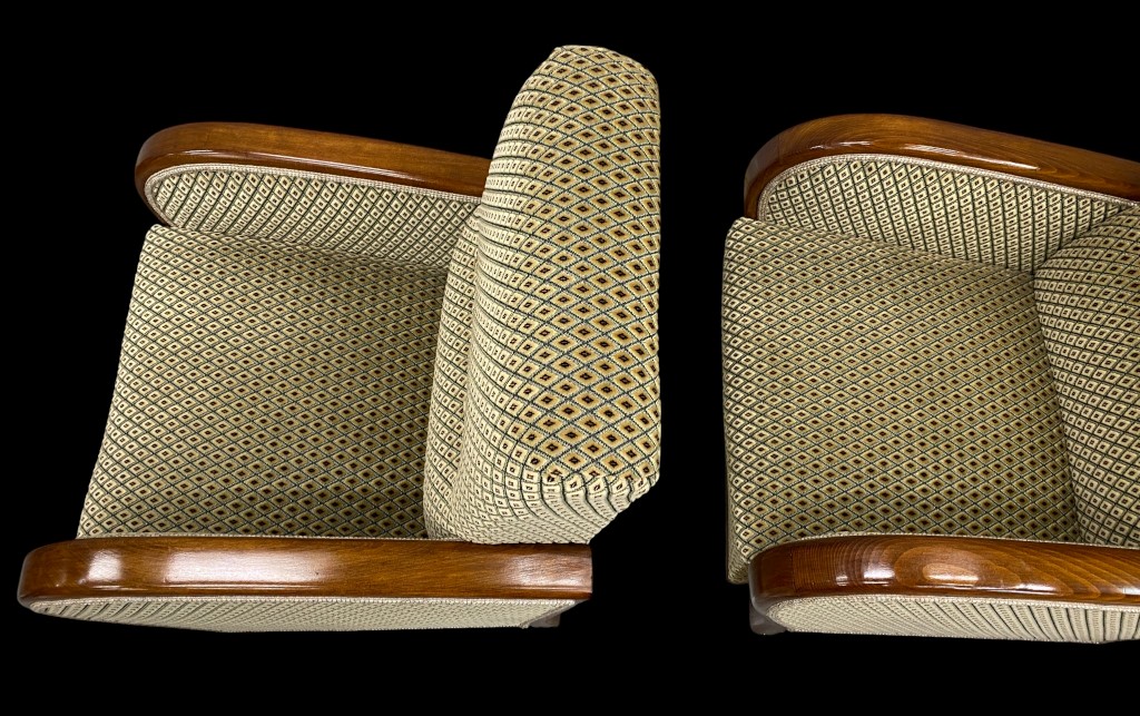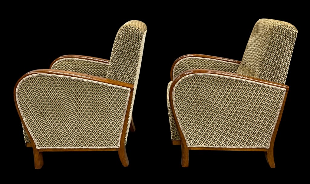 1930-40 körüli. Fa részei politúrozva, új kárpittal, minőségileg felújított szép állapotban.