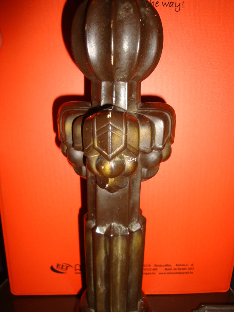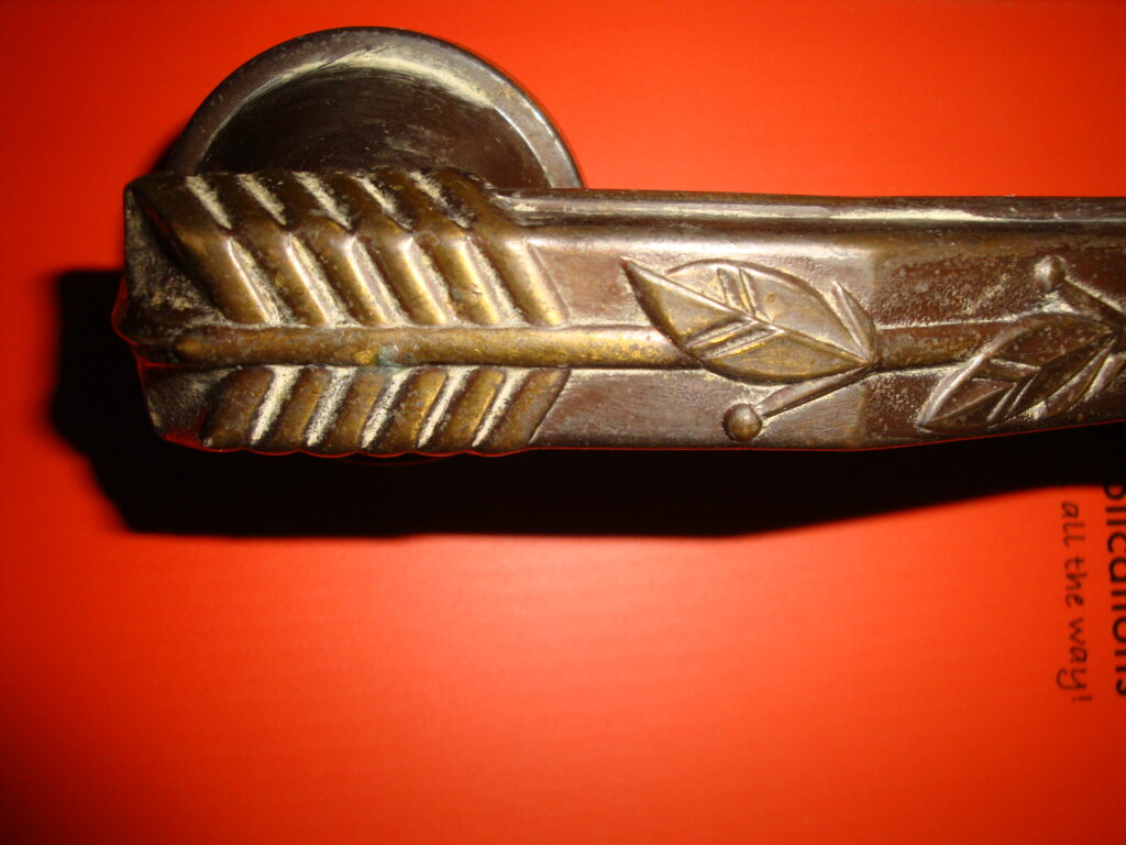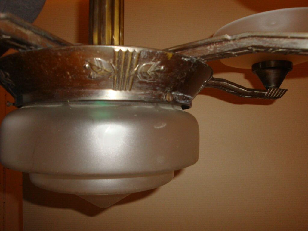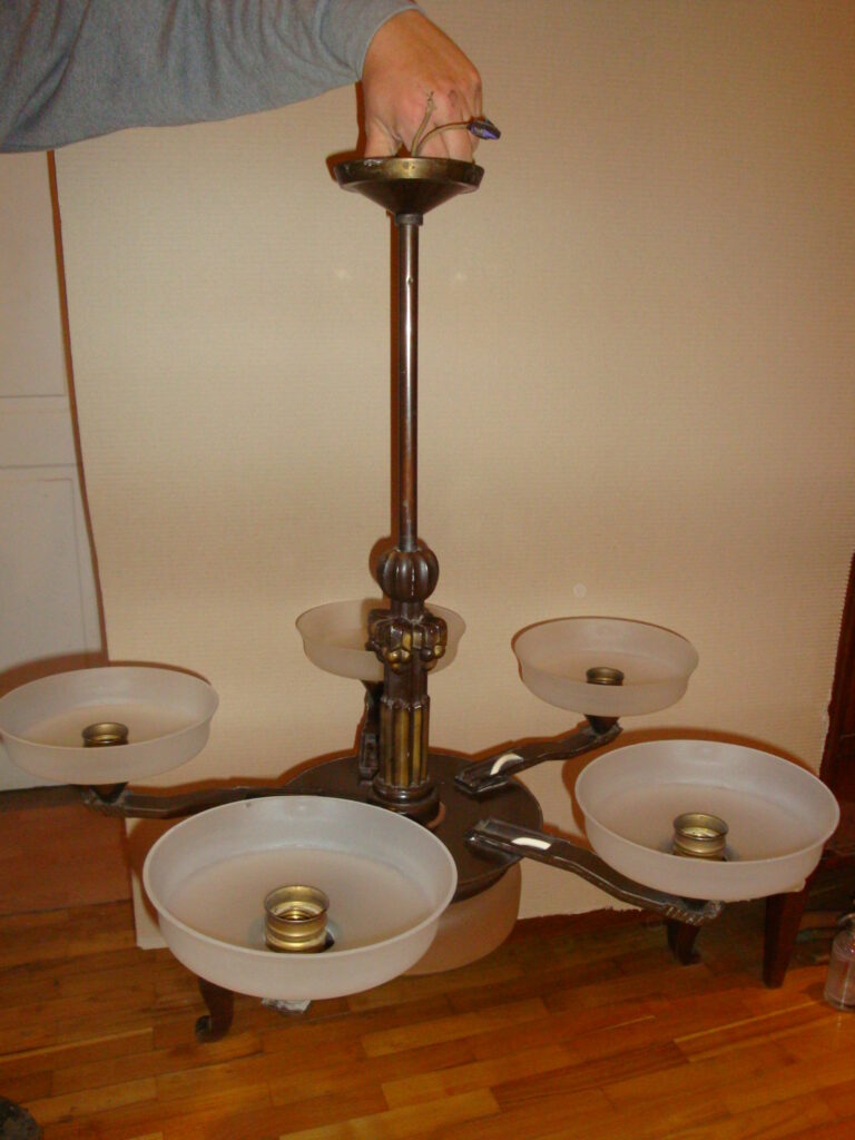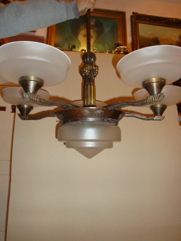 Art-deco rézcsillár: 1920 körüli bronzírozott rézcsillár. Eredeti üvegbúráival, szép állapotban. Korábban újrakábelezve. Méret: 70cm magas, d=60cm