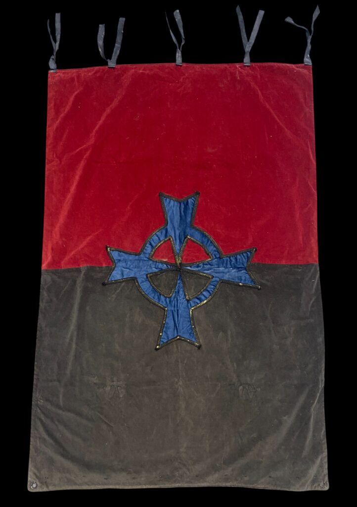 Barna alapon medalionban keresztet, olajfát, és kardot ábrázoló falizászló 9,10 x 1,41 m