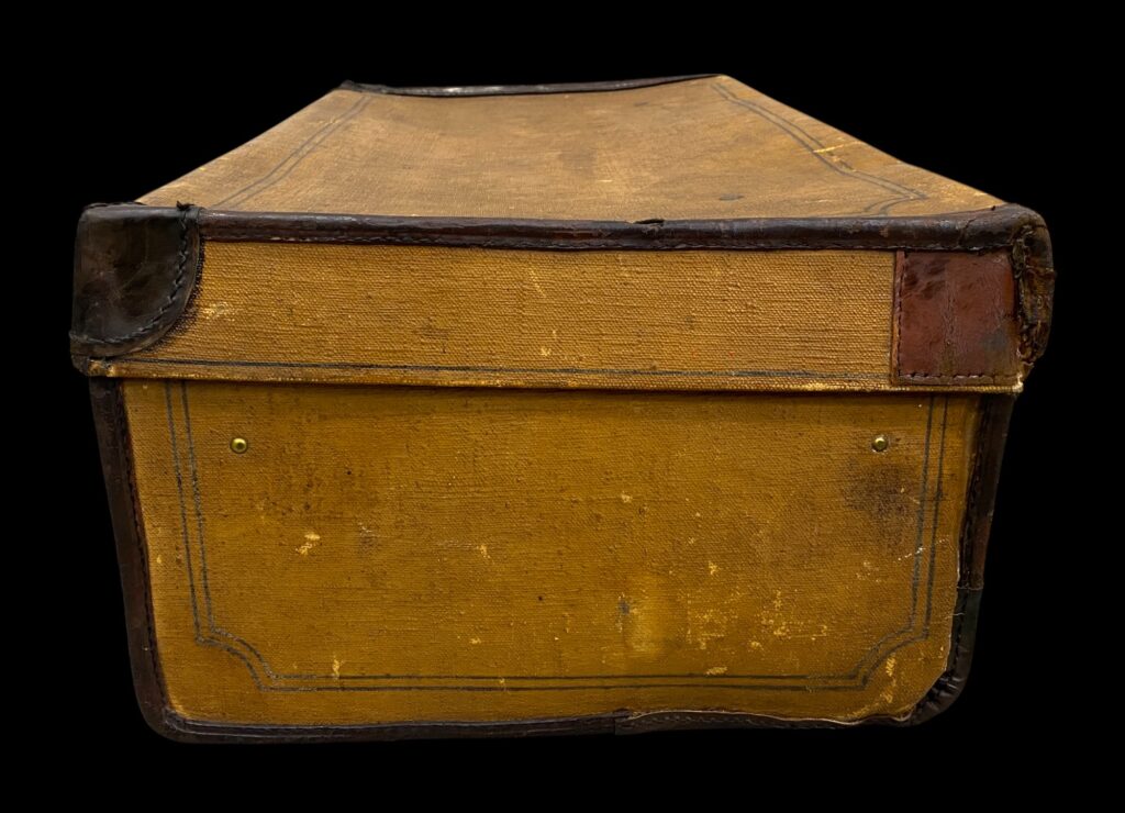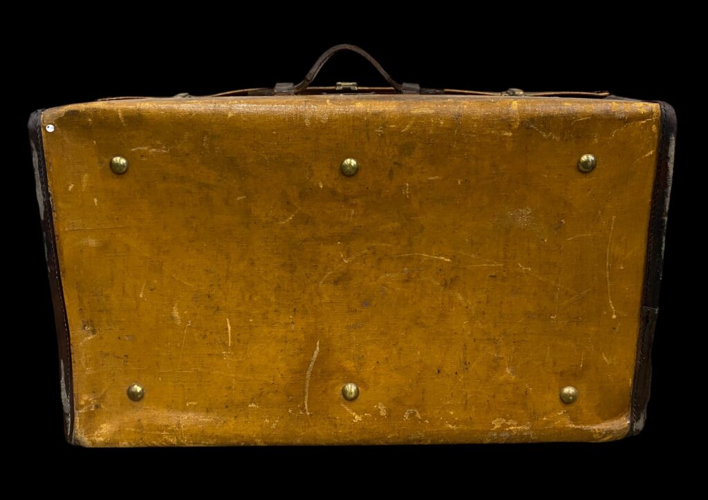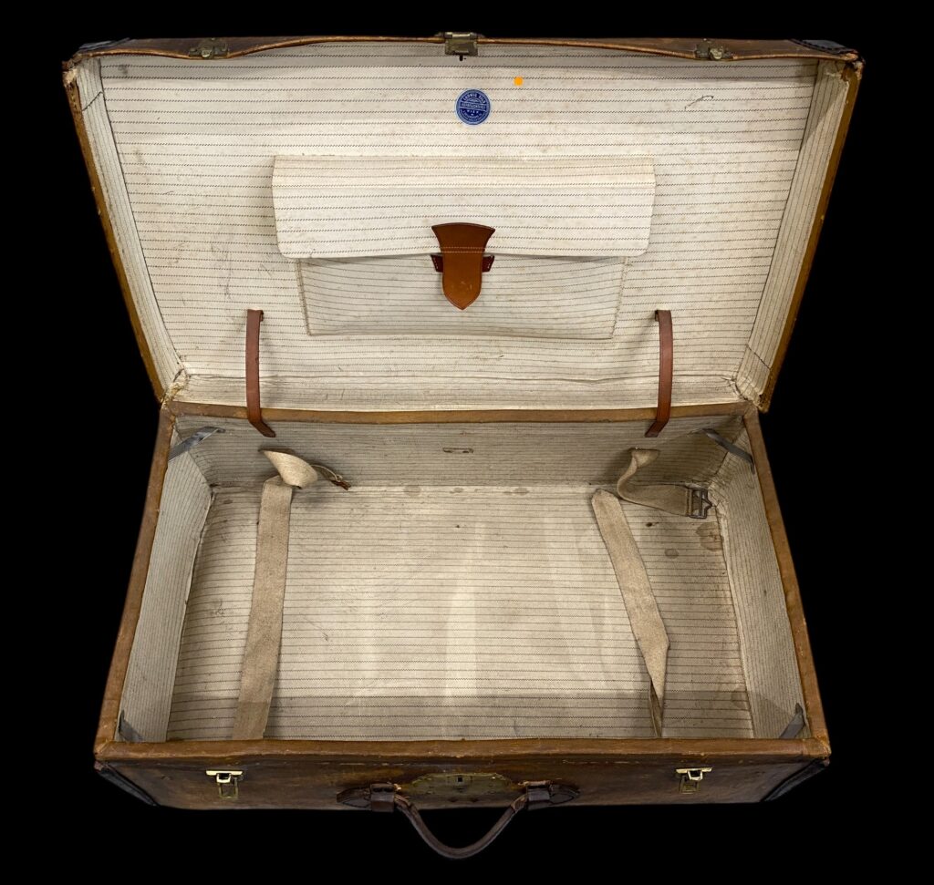 Bőr bőrönd belső fedlapján tárolóval: 20.sz eleje. Bőrborítással, bőr fülekkel. Tisztítva, enyhén sérült állapotban. Méret: 26x71x41 cm
