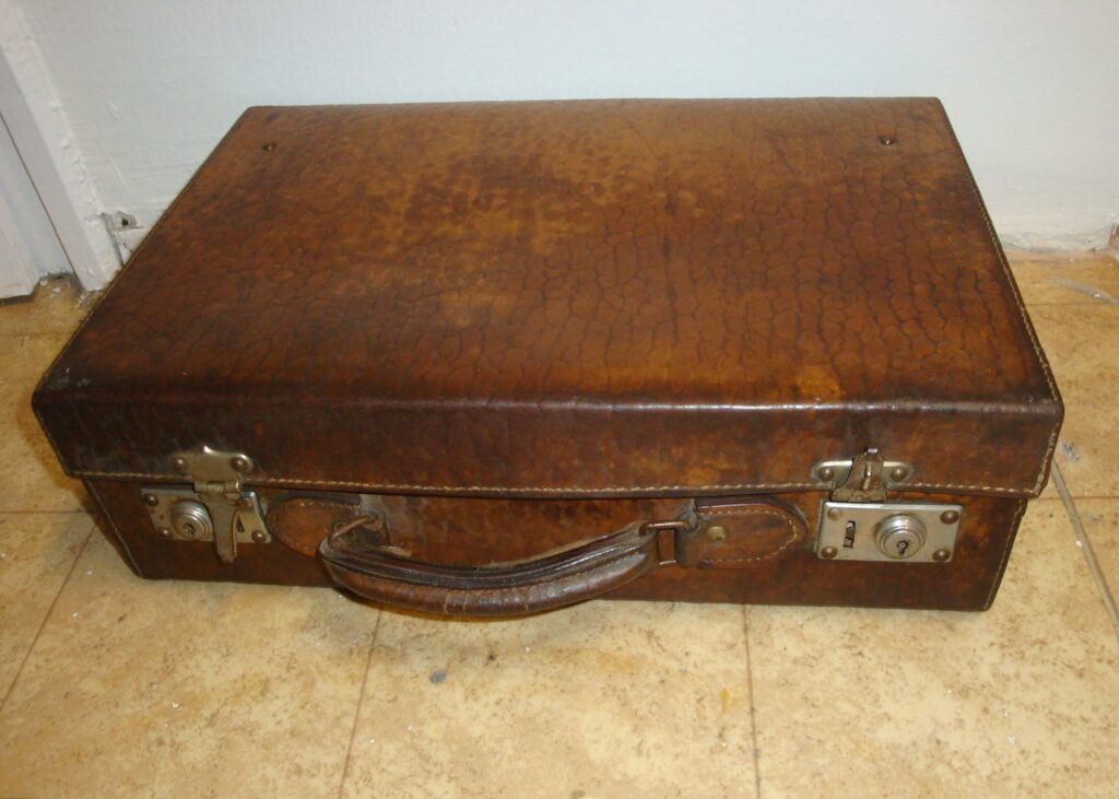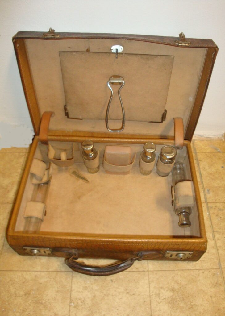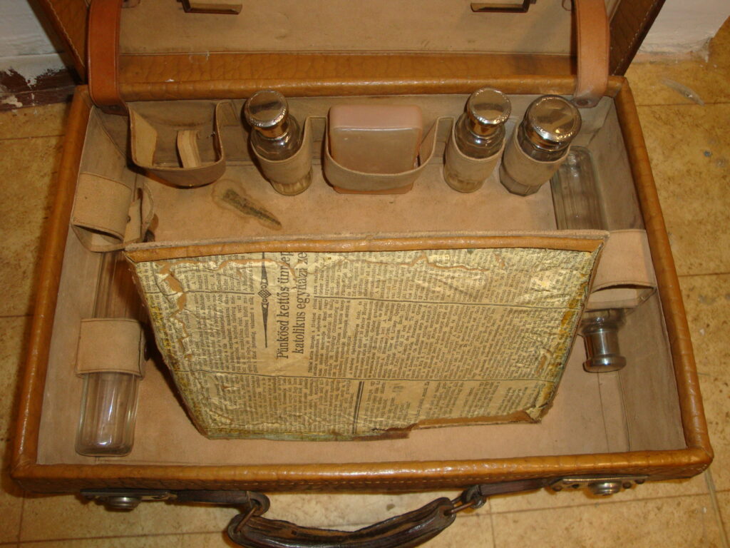 Bőr úti neszesszer: 1900 körüli. Kárpitozott belső, benne üvegcsék (hiányosan), lehajtható tükör (üvege hiányzik). Eredeti, fellelt állapotban.