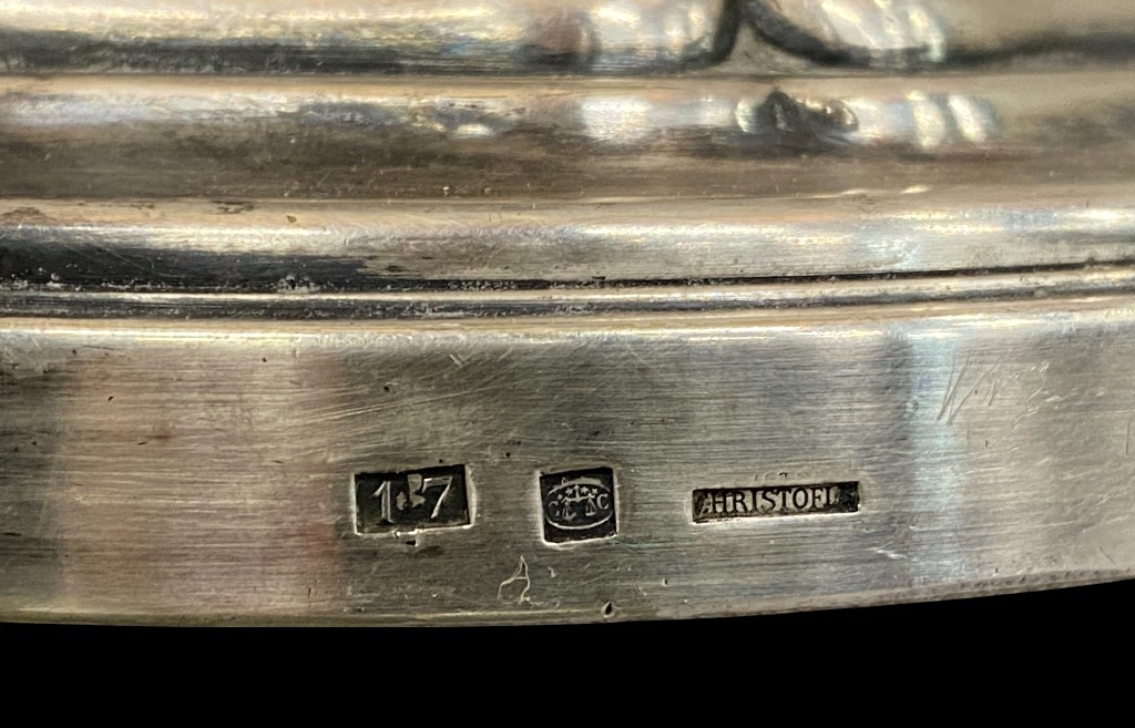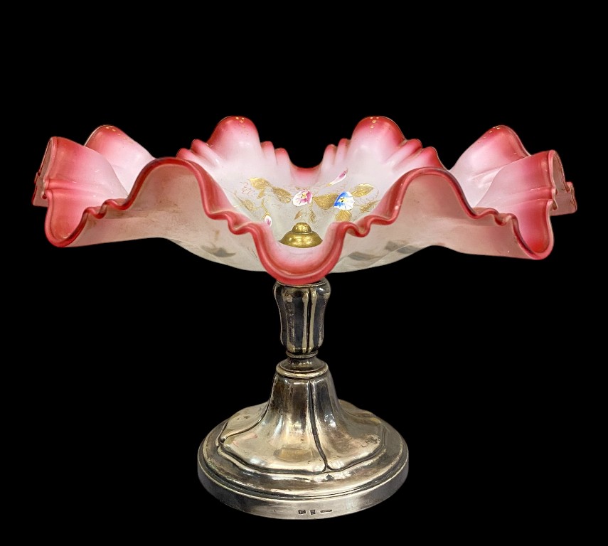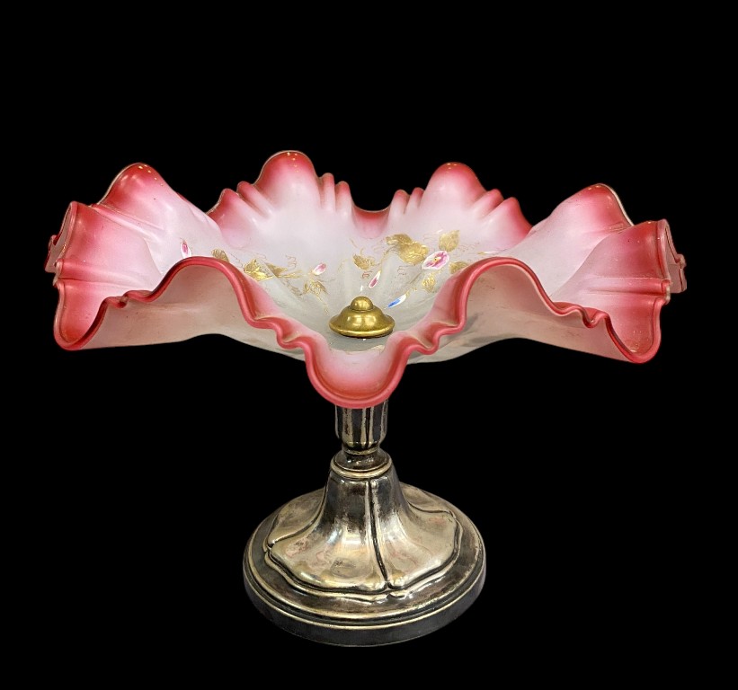 20.sz. első fele. Ezüstözött christofle jelzésű fém talapzaton, virágos festésű fodros szélű üveg kínáló tál.