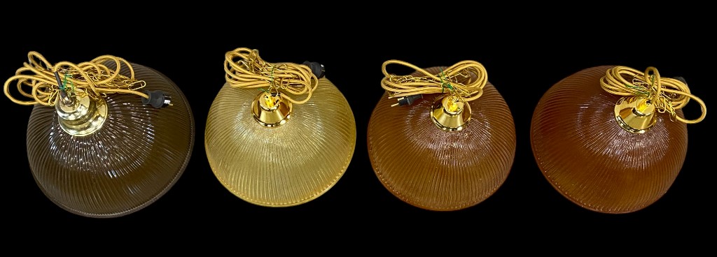Új készítésű, formába öntött üveg hatású ernyővel. Sárgaréz lánc függesztéssel. Textil borítású új vezetékeléssel, E27 foglalattal. Működőképes.