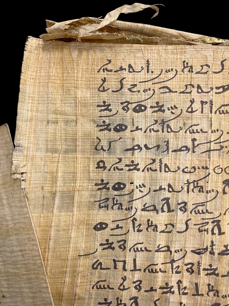 Valódi papirusz tekercs, kézi festésű hieroglifákkal.