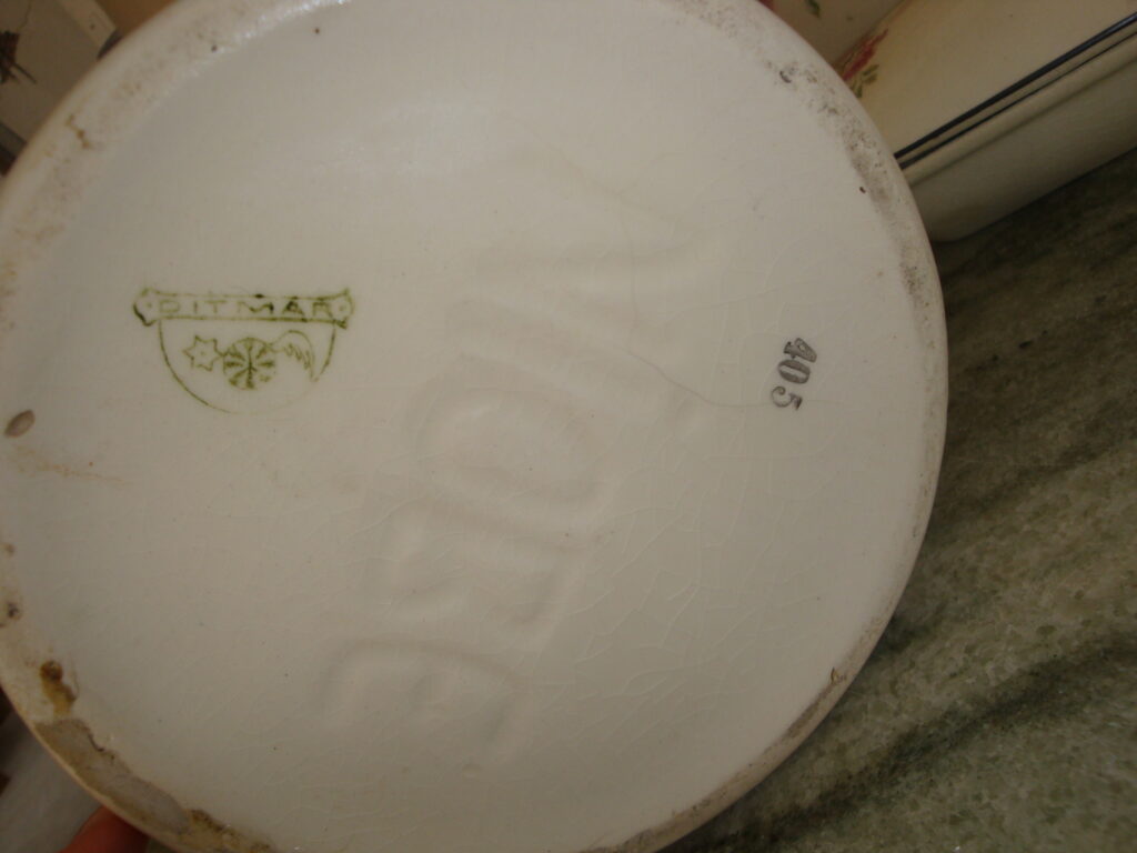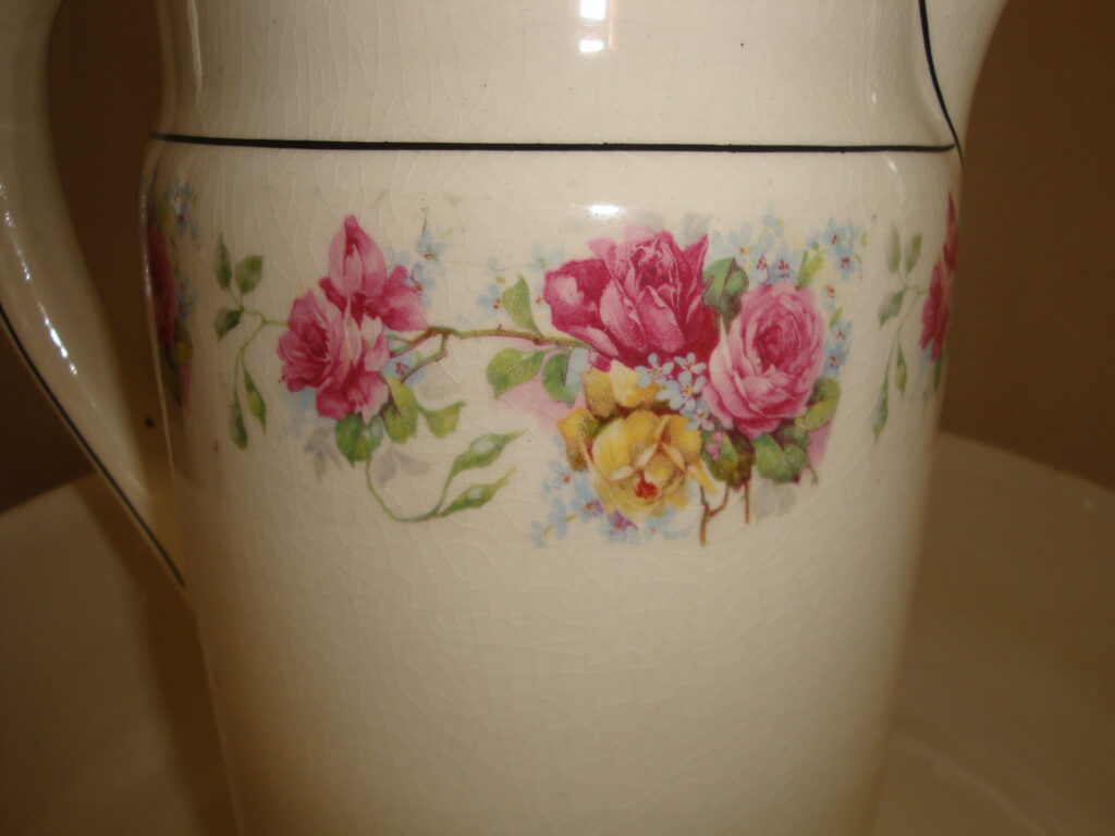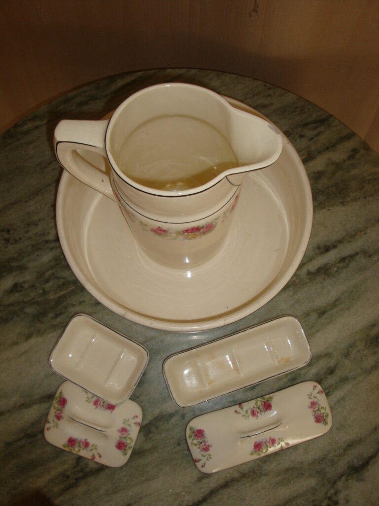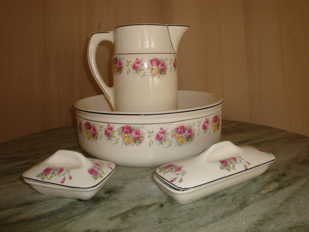Rózsás mosdó szett: 1900 körüli fajansz mosdó szett. Részei: lavór, kiöntő, szappantartó, kefetartó. Szép állapotban. Alján jelezve: DITMAR.