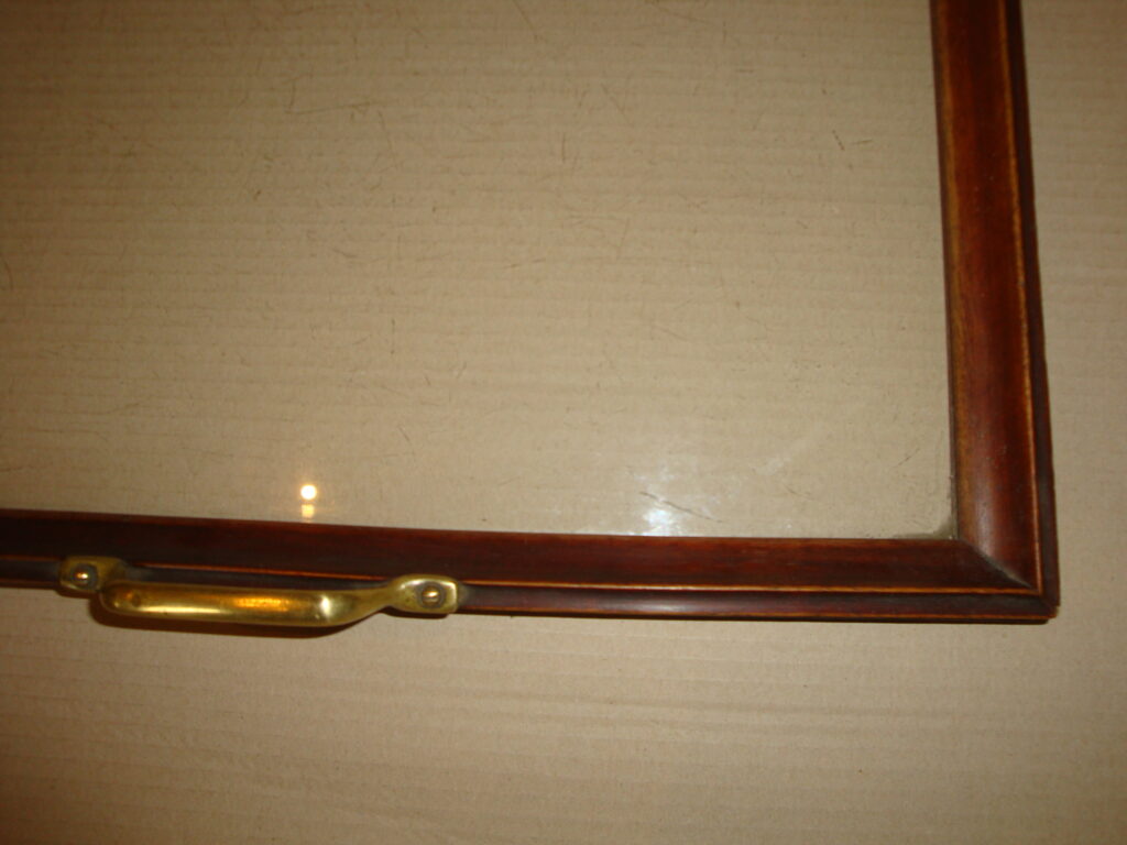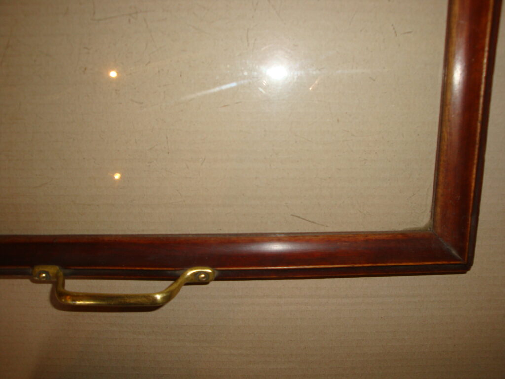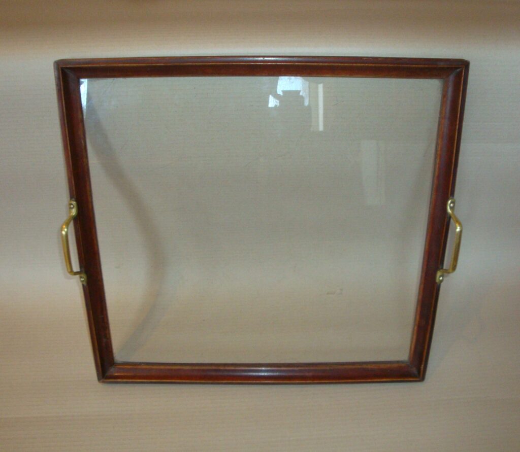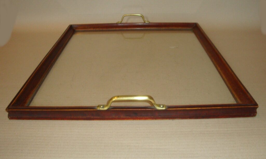 Fa keretű, üveg aljú tálca: 20. sz. első harmada. Pácolt fa kerettel, sárgaréz fogantyúkkal, vastag üveg aljjal, azonnal használható állapotban.