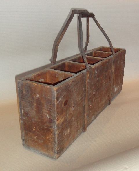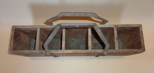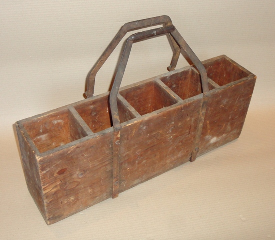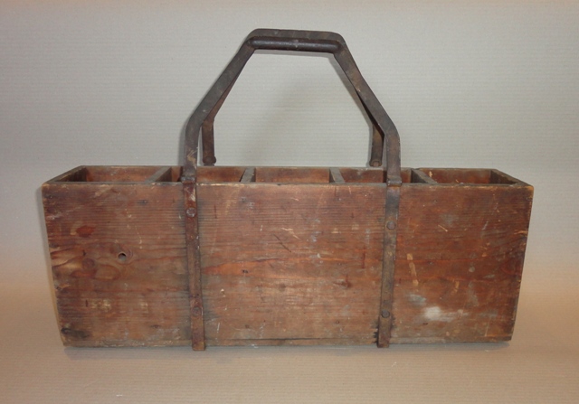 Hordozható üvegtároló: 20. sz. Fa testű, vas fogantyús rekesz. Eredeti, fellelt állapotban. Méret: 42(füllel)×61,5×16 cm