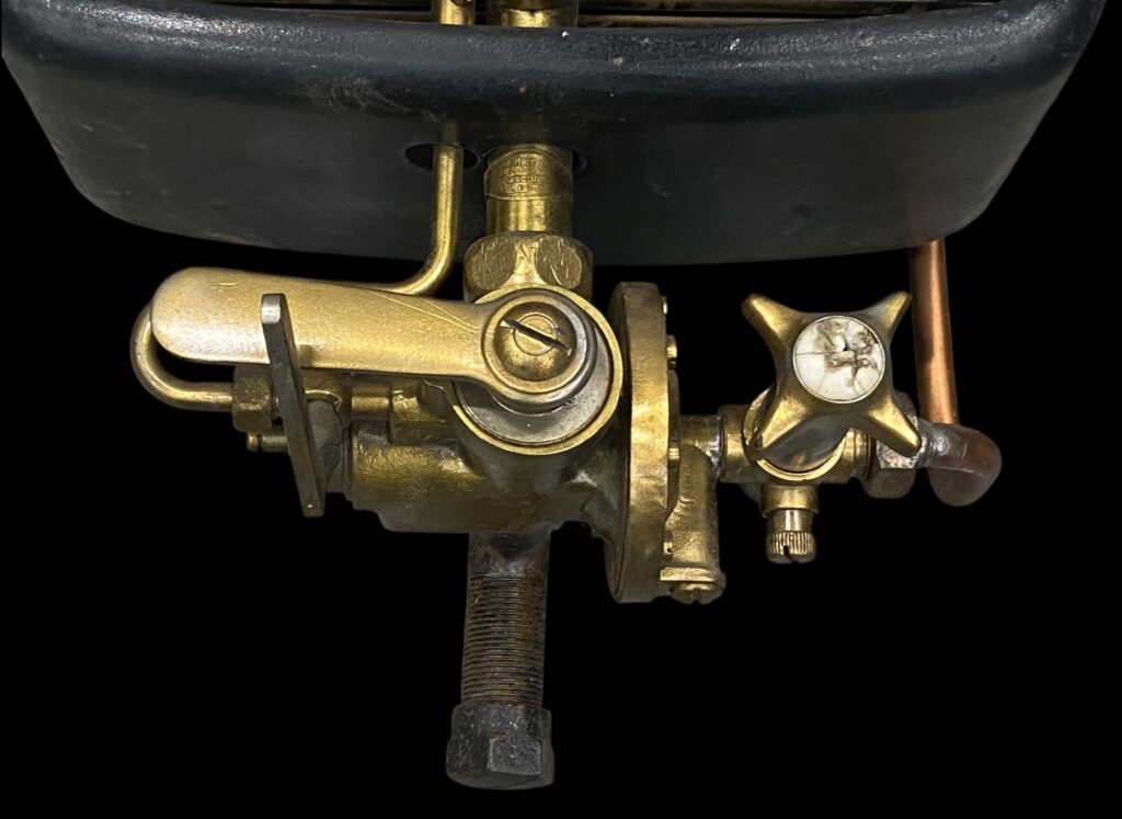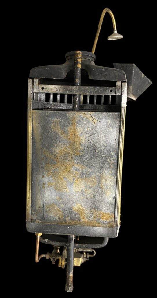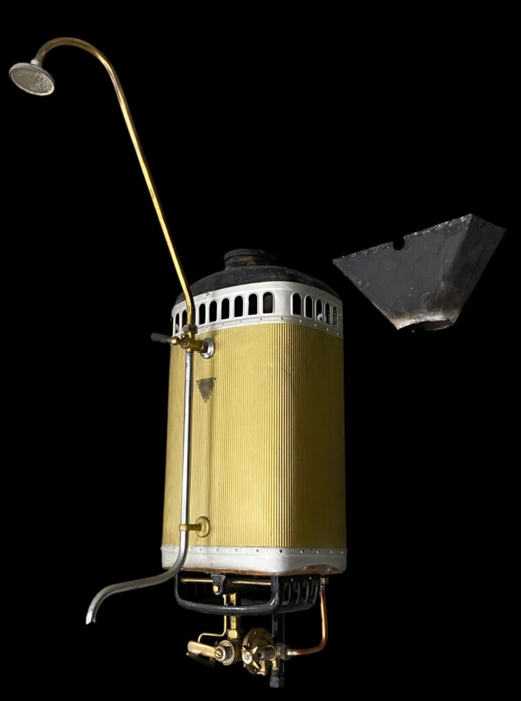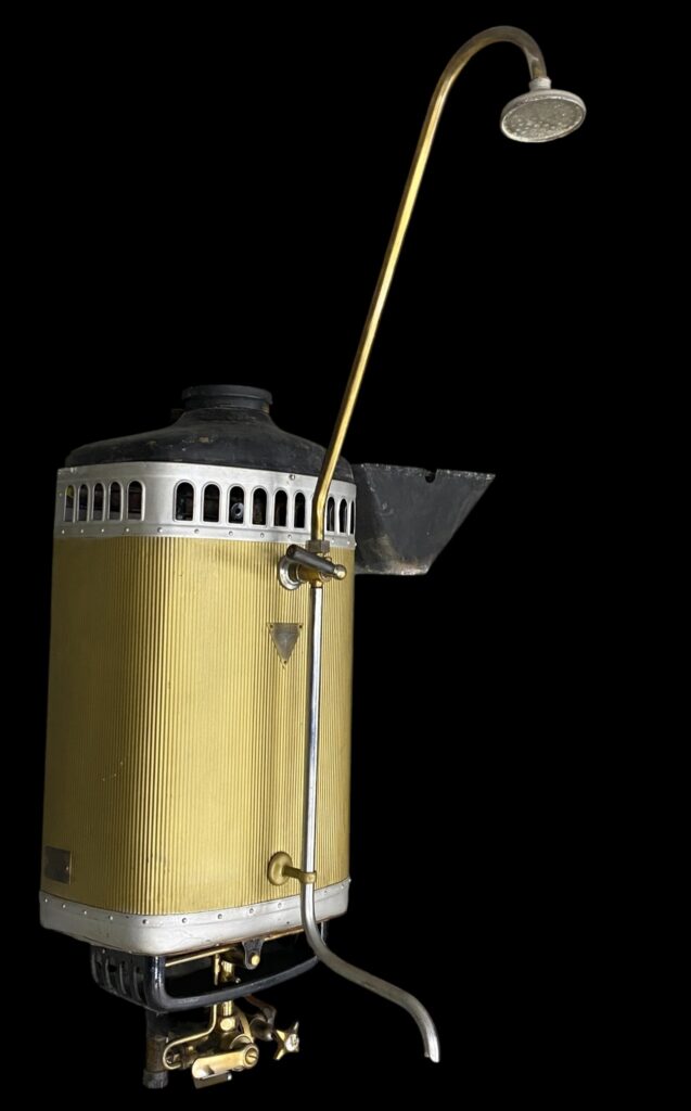1920–40 körüli. Festett bordás acéllemez és vörösréz burkolat, acélvázon, réz szerelékkel. Gázüzemű, kéménybeköthető. Korábban felújított, szép állapotban. (bojler)