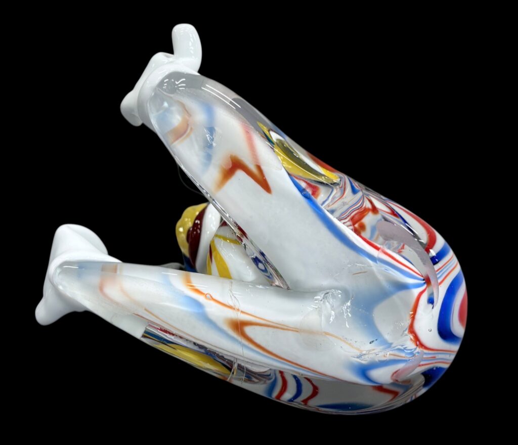 Murano, 1980 körül. Színtelen, fehér, sárga, piros, kék színű, fújt, melegen alakított üveg. Jó állapotban.