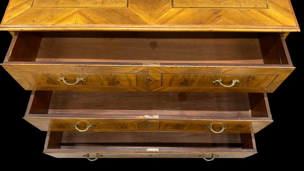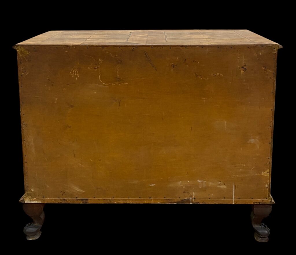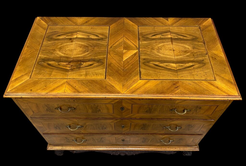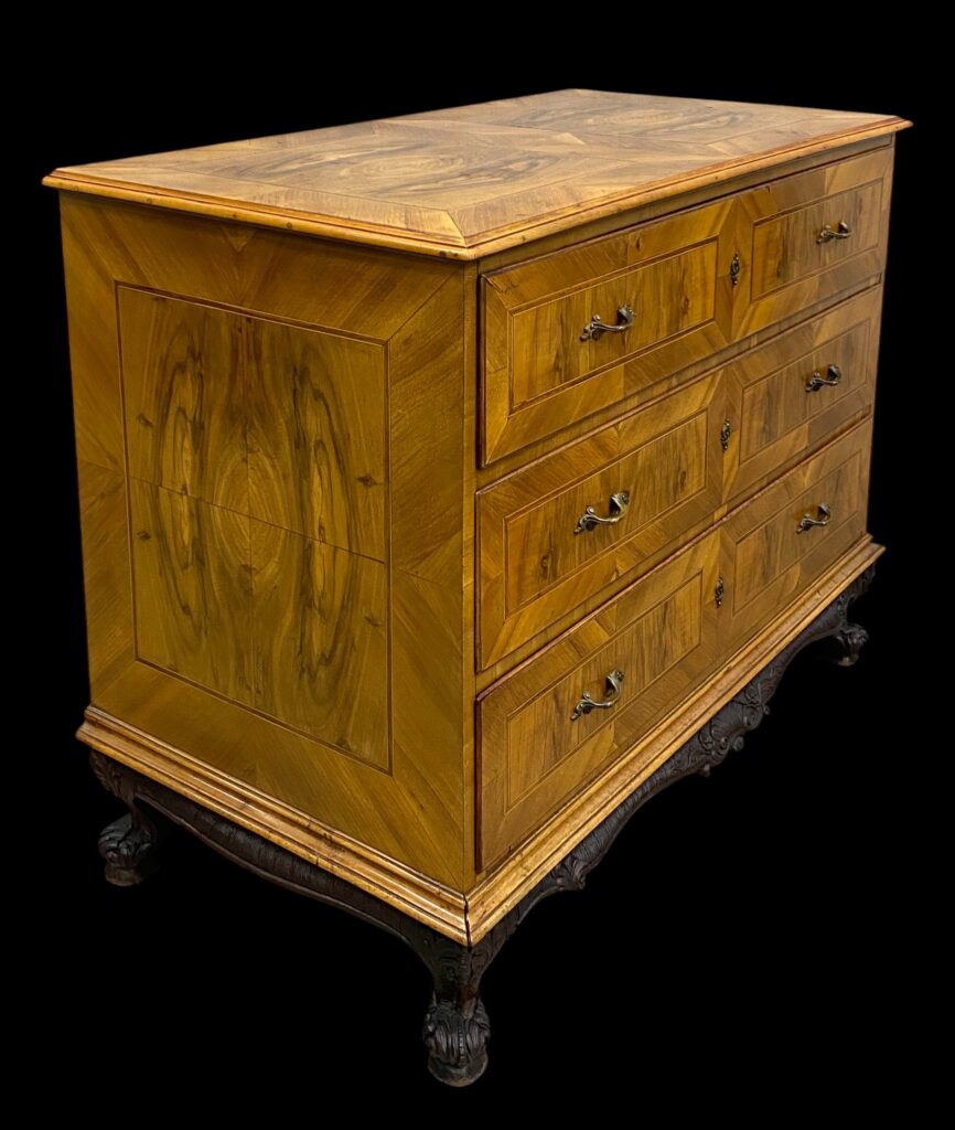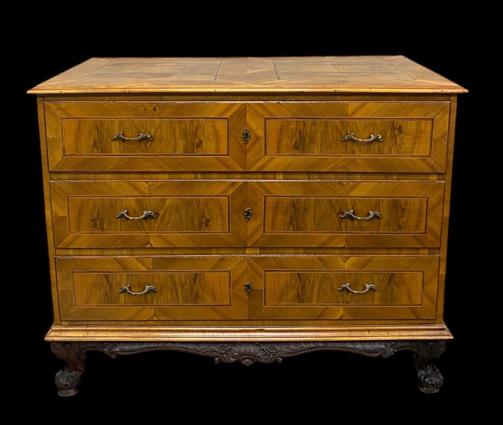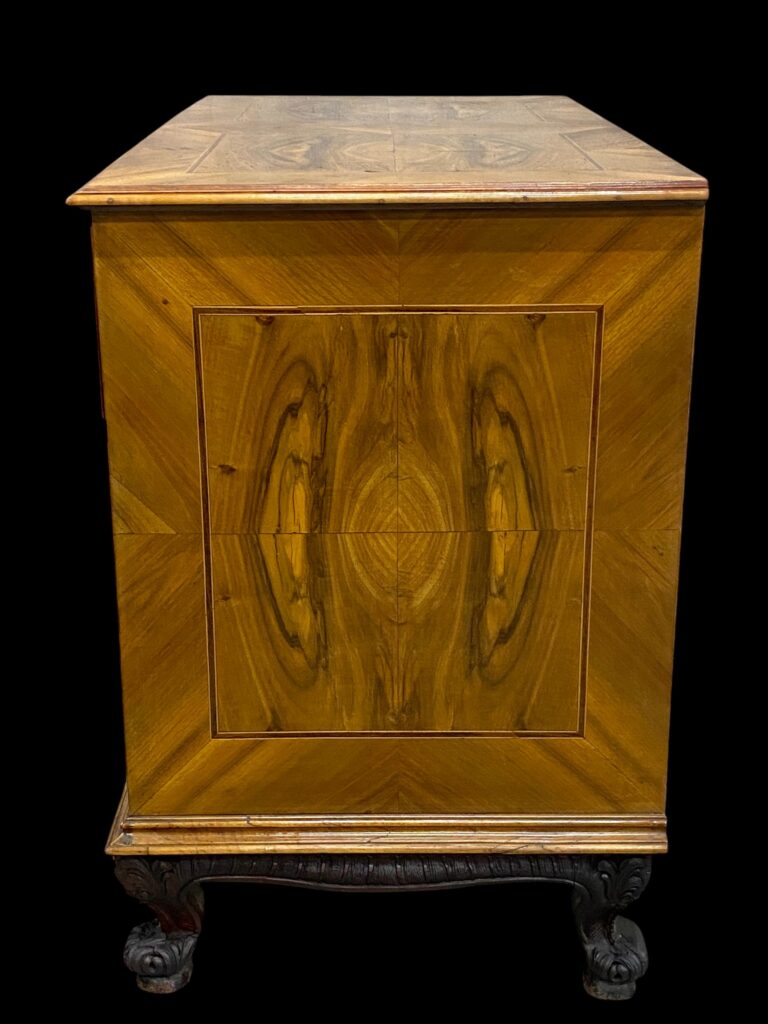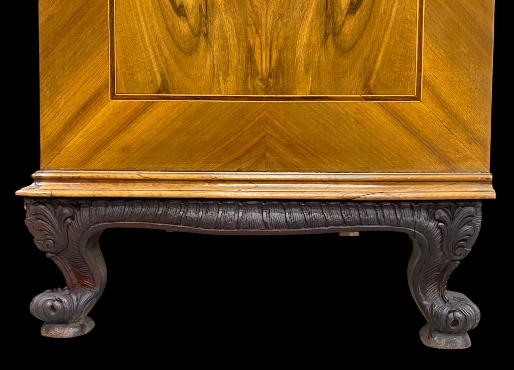 20. sz. első fele. Fenyőfa alapon forgatott dió furnérral, egyenes vonalú intarziával. Barokk stílusú faragott alsó kávával és lábakkal. Rétegelt lemez hátlappal, kulcsokkal, működőképes zárral. Öntött réz fogantyúkkal. Szép eredeti állapotában.