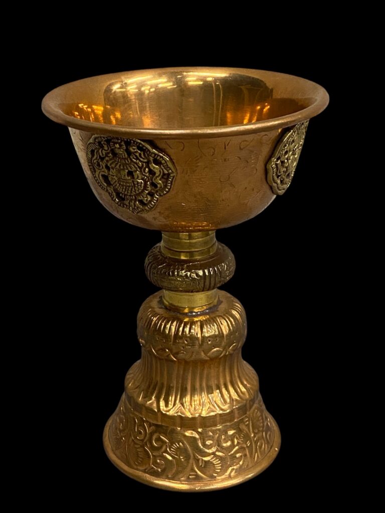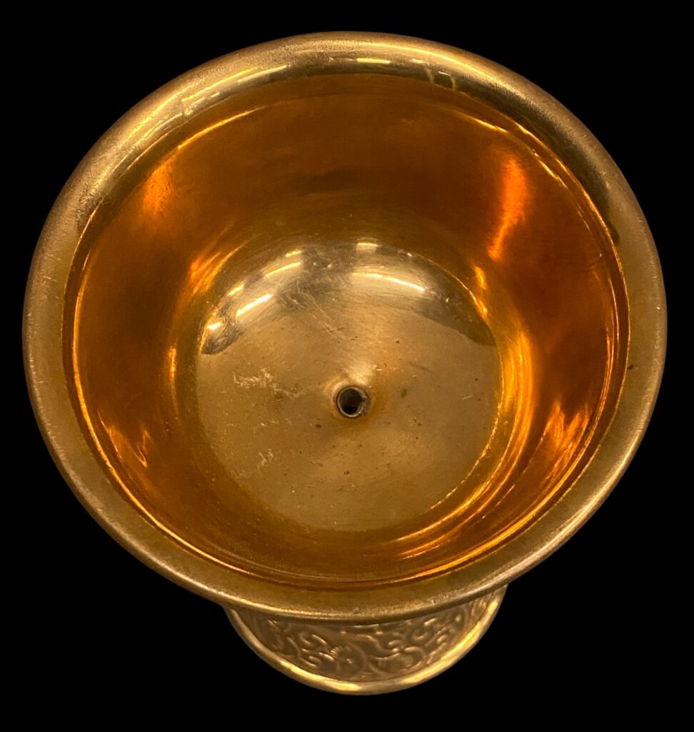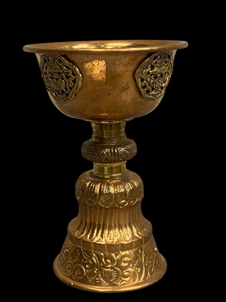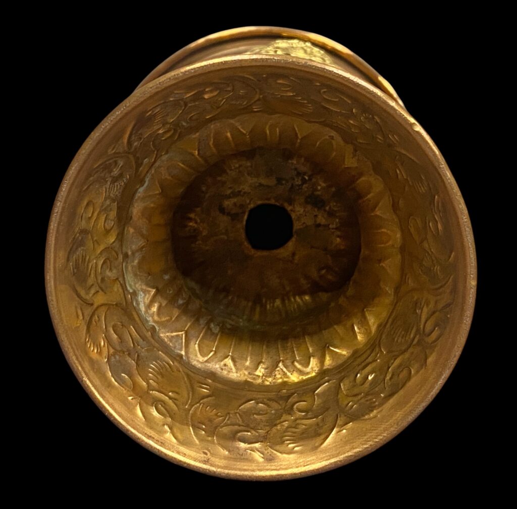 Polírozott, vésett és kalapált vörösréz, rátét sárgaréz dekorral. Szép állapotban.