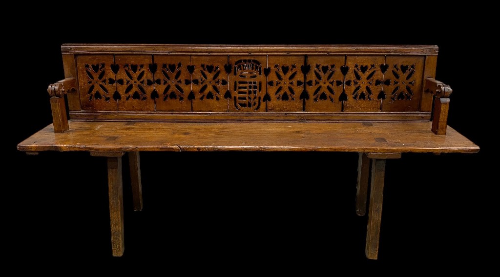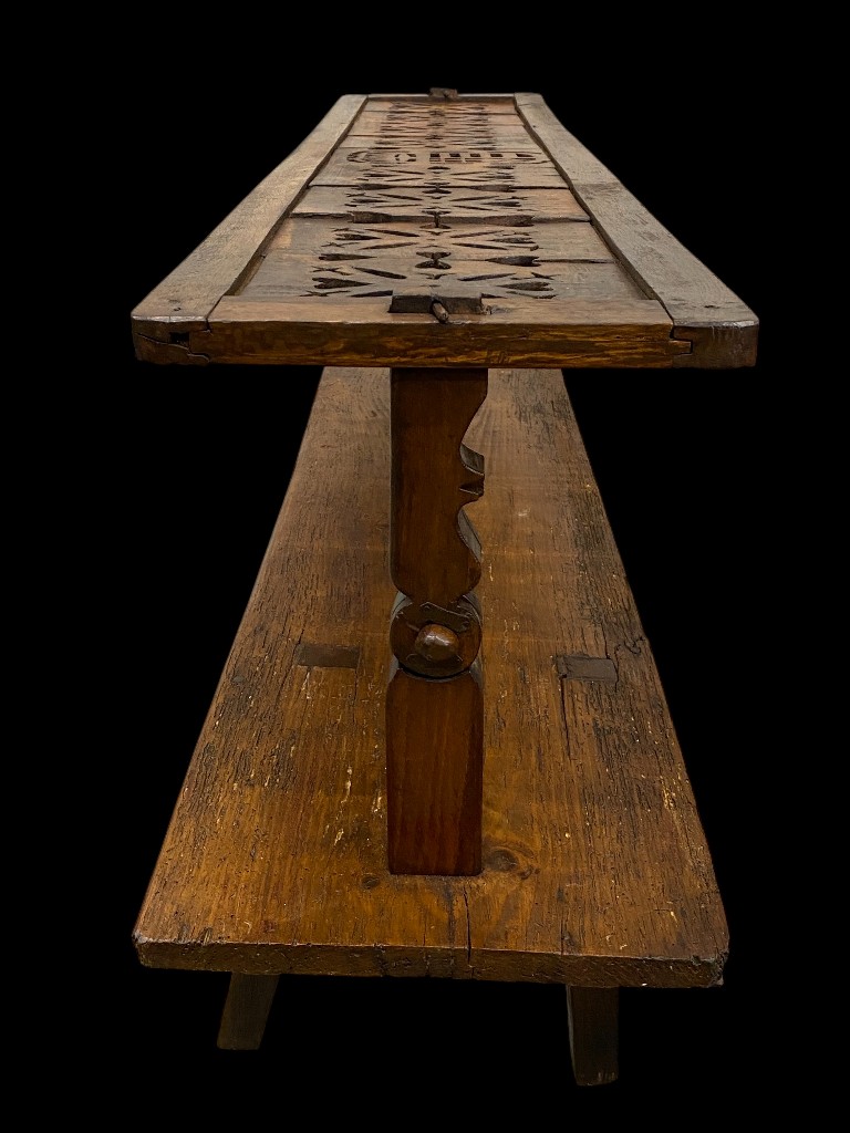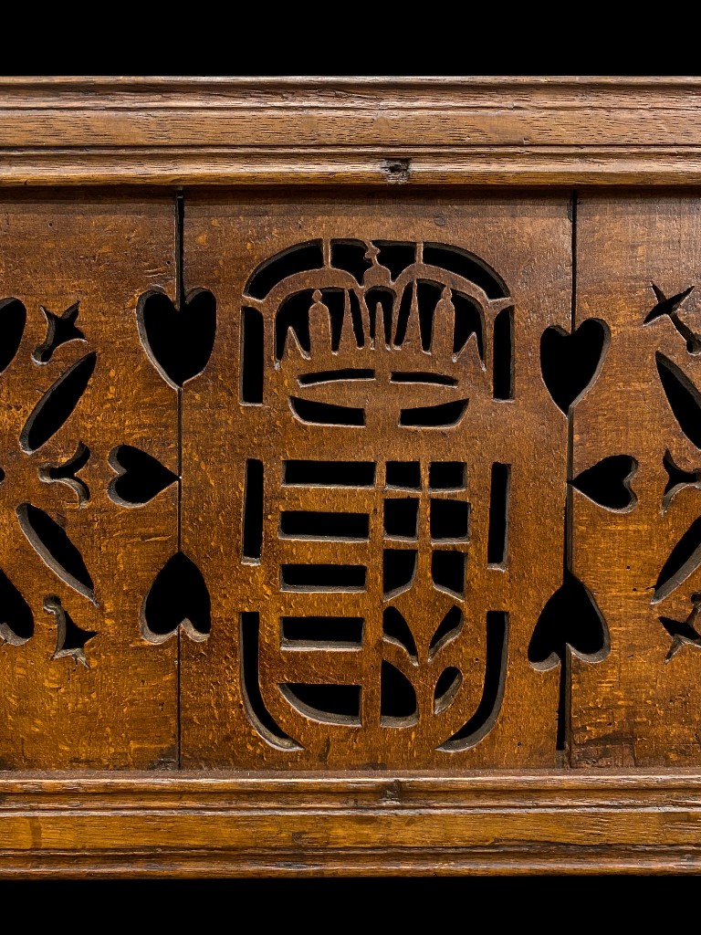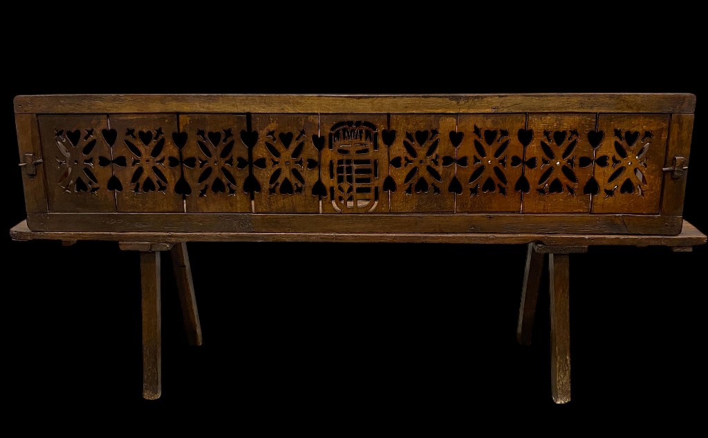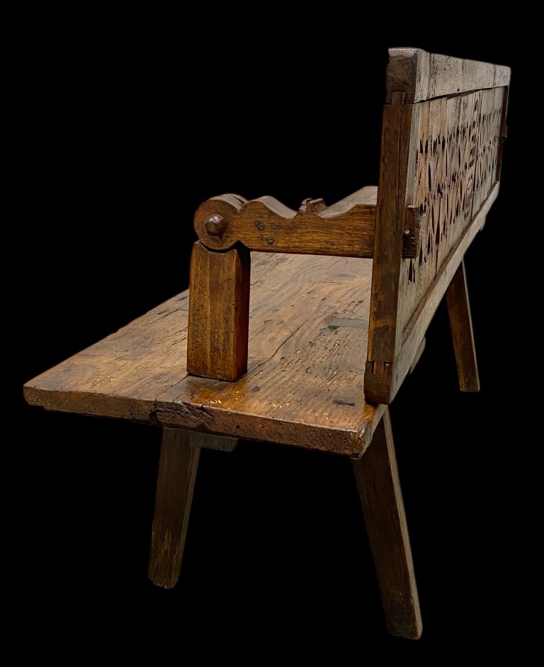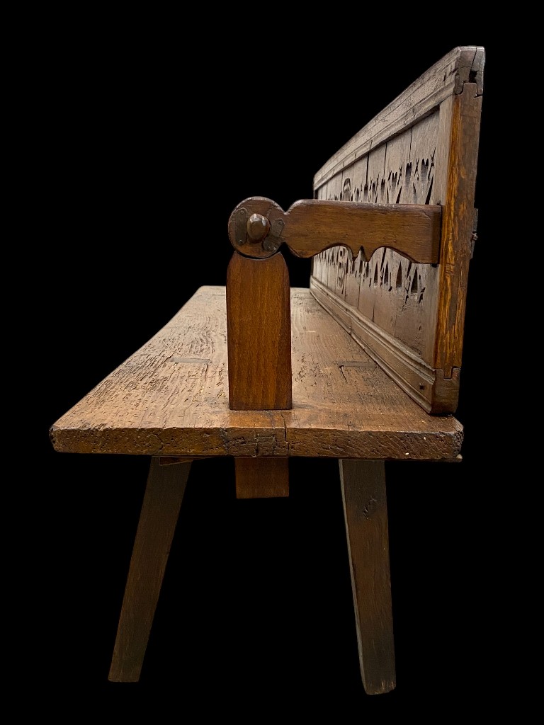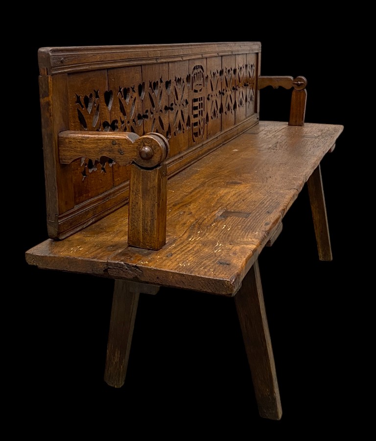 19. sz. közepe körül. Tölgy és fenyőfa. Áttört díszítésű, átfordítható hátlappal. Csapolt lábakkal. Vaxolt felületkezeléssel. Jó állapotban.