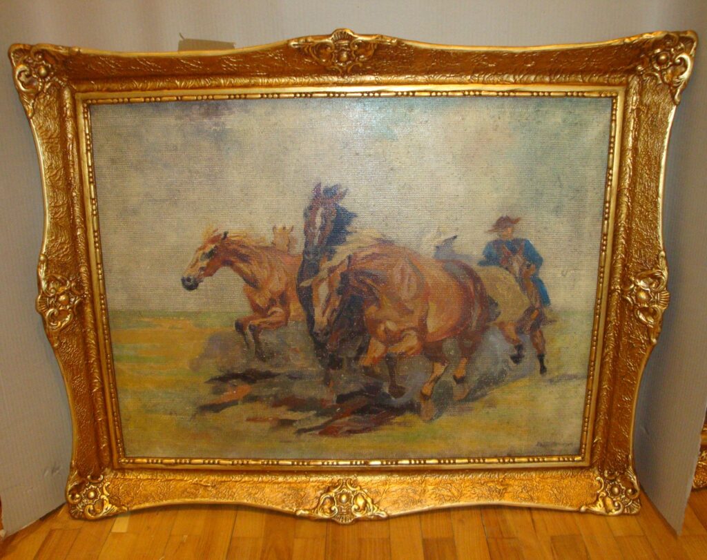 Ménes csikóssal (ismeretlen festő): 20. sz. első fele. Technika: olaj-vászon. Szignatúra a jobb alsó sarokban.