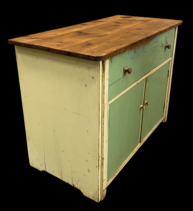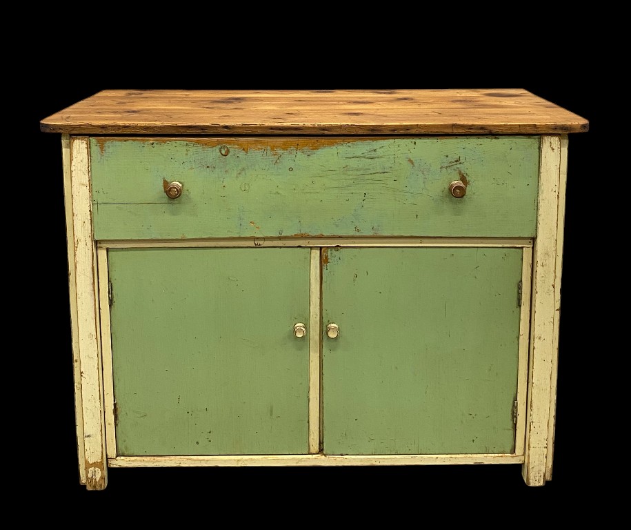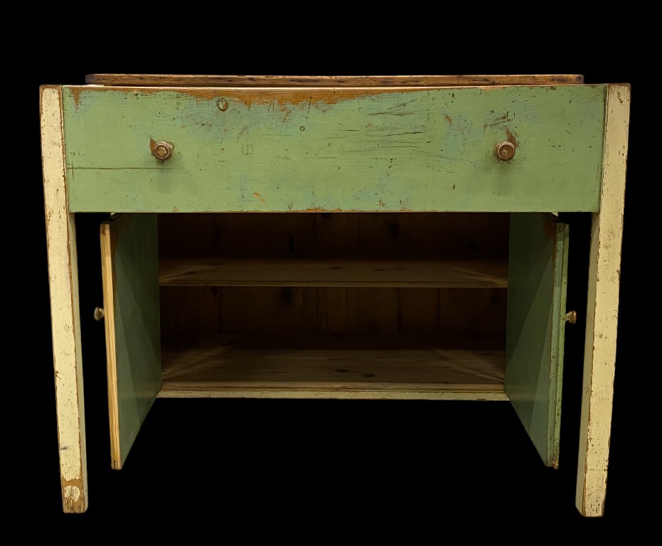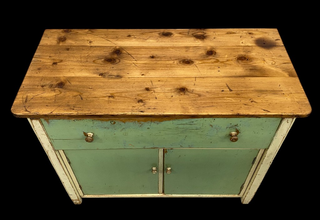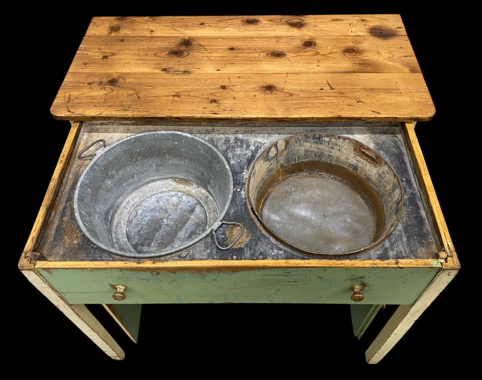 20. sz. első fele. Festett fenyőfa. Fiókját kihúzva 2 mosogató lábas található. Eredeti színe megtartva, vaxolt felületkezeléssel. Olajozott tetővel. Felújított állapotban.