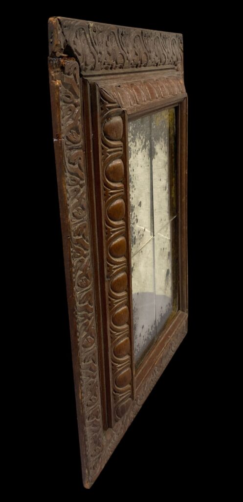 Faragott fa. 4 részre osztott tükörrel, szándékos vakultsággal a sarkoknál. Jó állapotban.