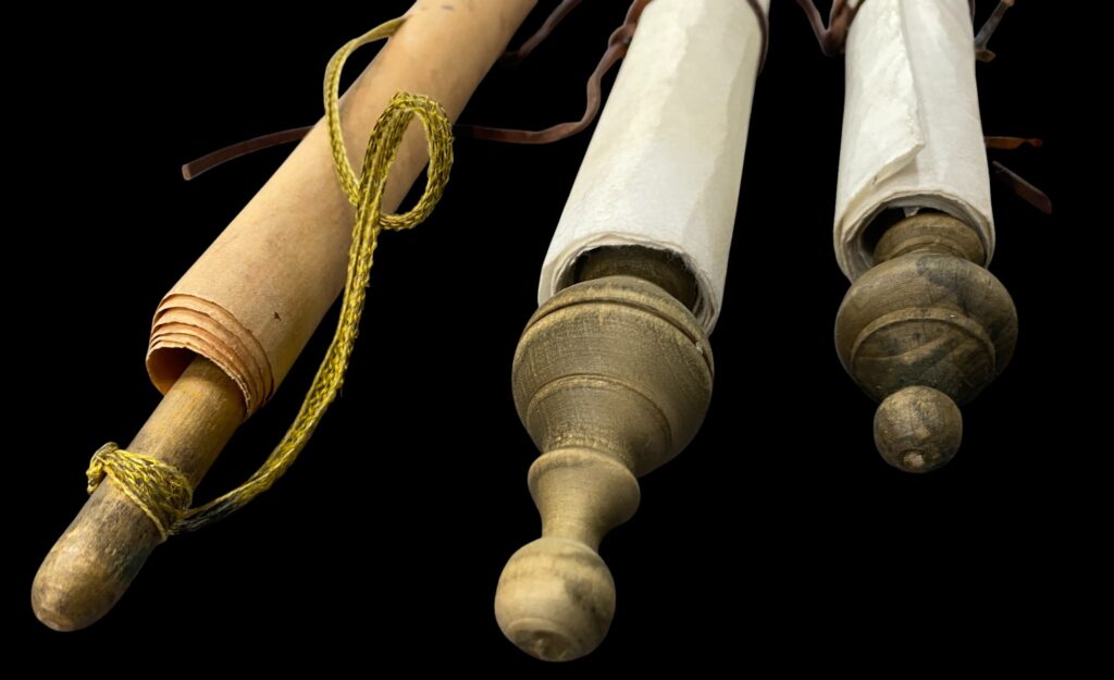 Esztergált fa, papír, bőrszíjjas átkötéssel. Patinás, jó állapotban.