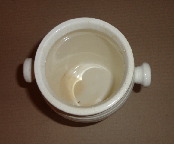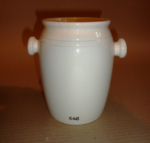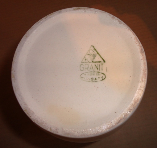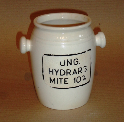 Patikai tégely 4.: 20. sz. eleje. Mázas fajansz. Frontján felirat: UNG. HYDRARG MITE 10 %. Alján jelzés: GRANIT, MADE IN HUNGARY.