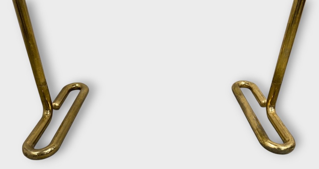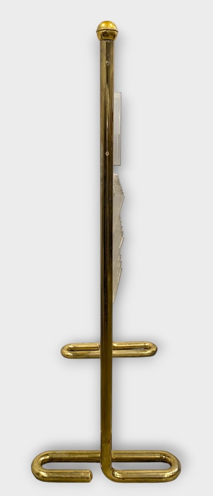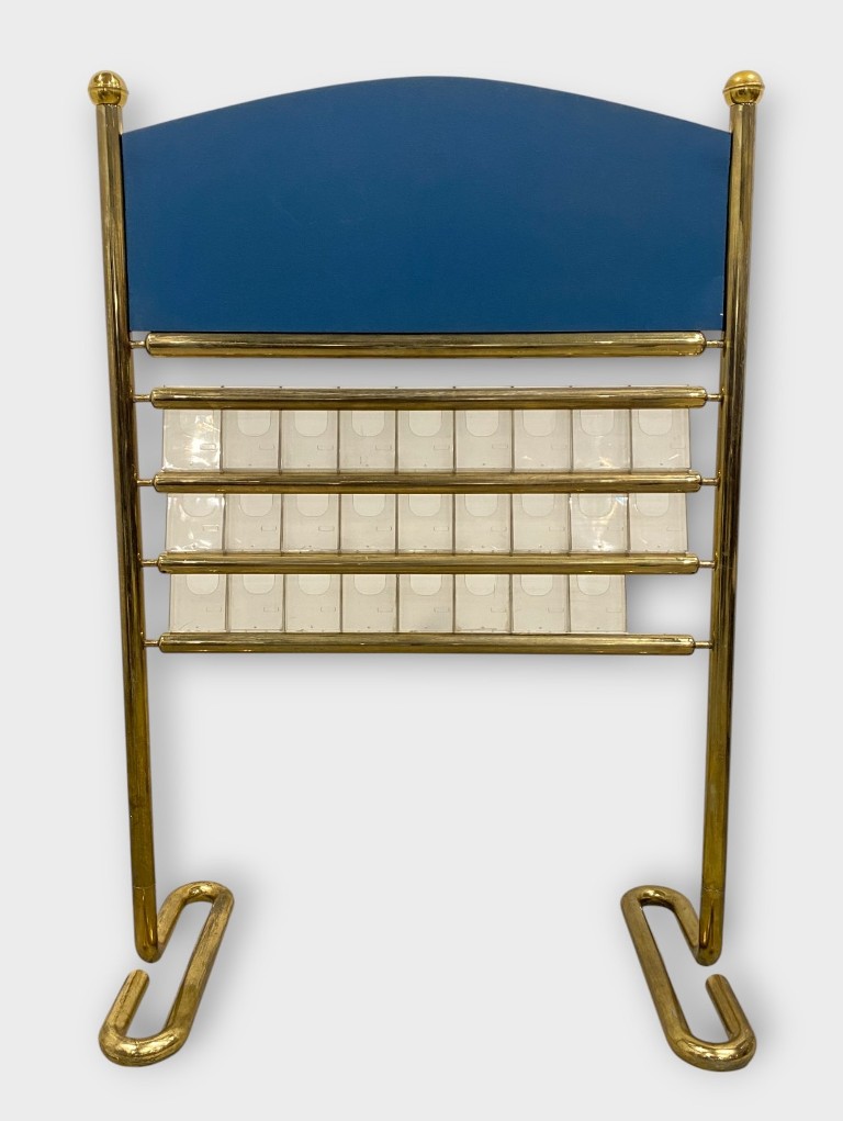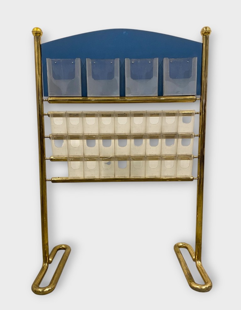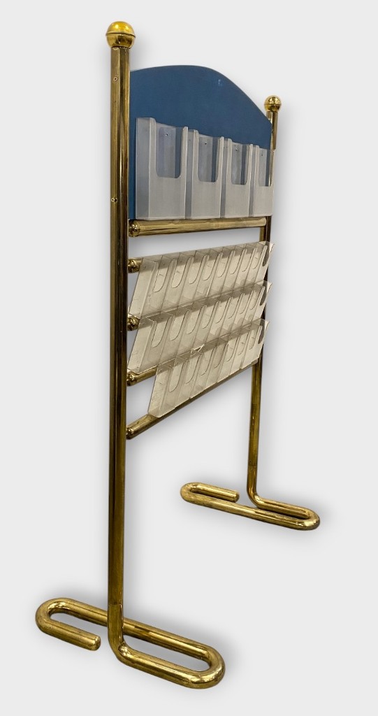 Prospektus tartó állvány: Aranyozott réz, plexi tartókkal. Jó állapotban. Méret: 176 x 123 x 65 cm