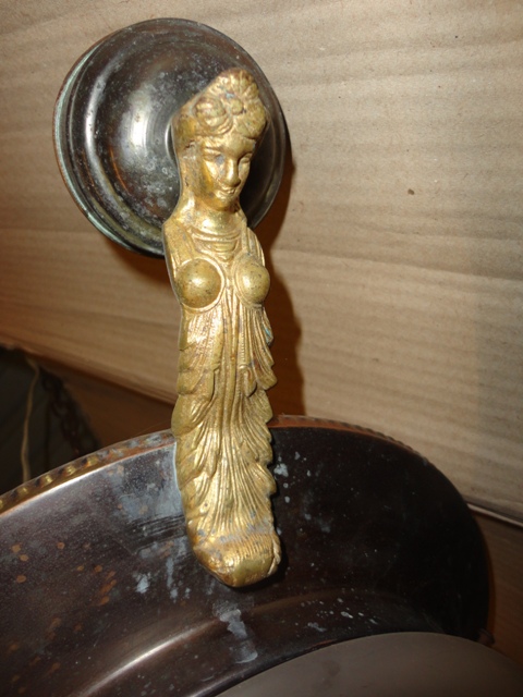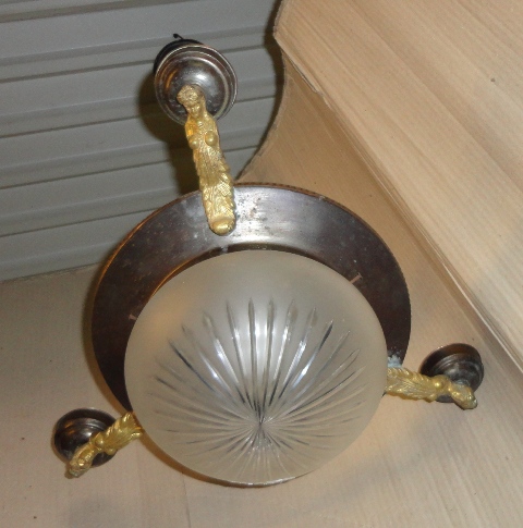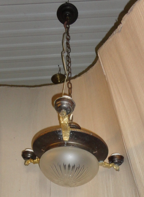 Réz csillár 1.: 1920 körüli réz csillár bronzírozva, a karok aranyozva. Eredeti középső búrájával; a 3 karról hiányoznak a búrák. Eredeti, fellelt állapotban.