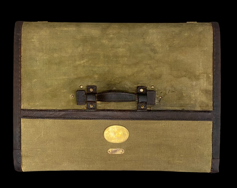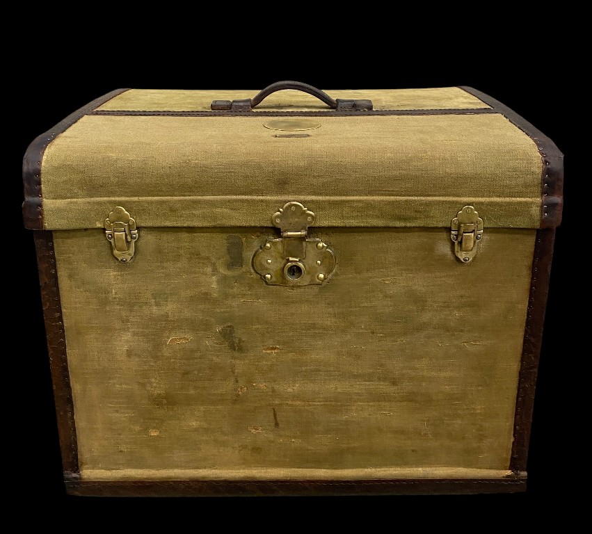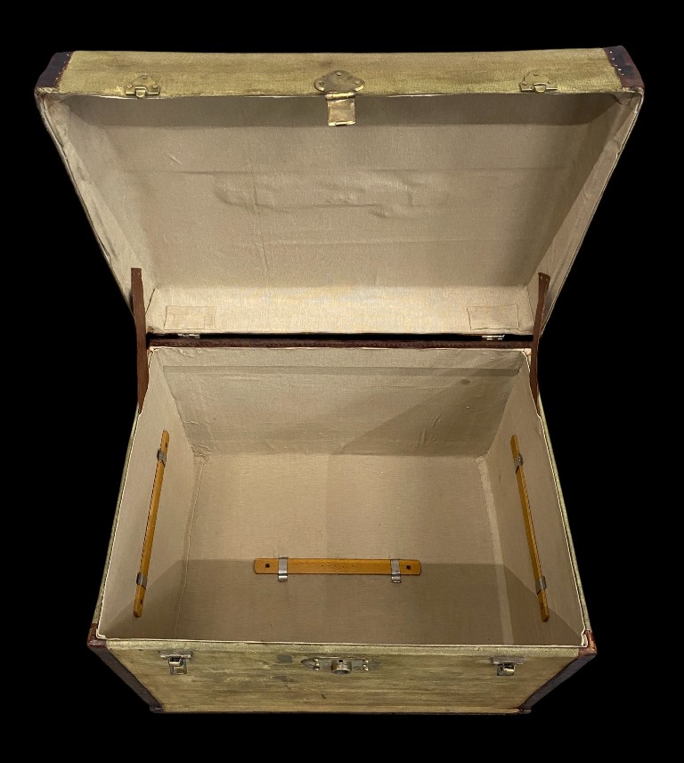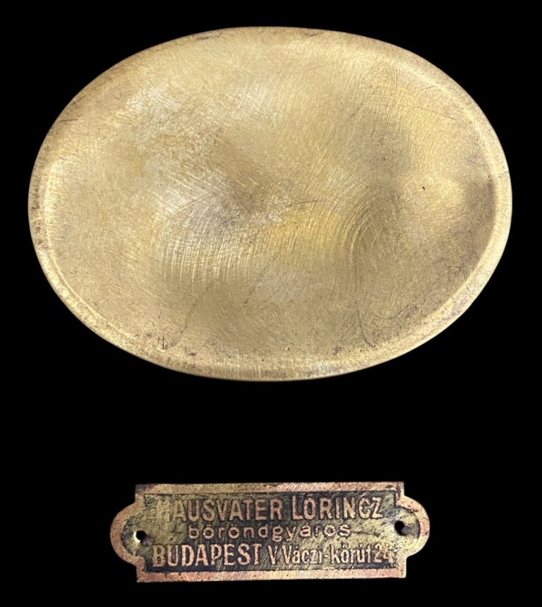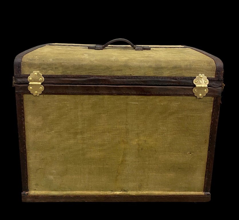 1900 körüli. Fenyőfa vázon vászon, réz borítással, bőr szegéllyel. Teljesen felújított állapotban.