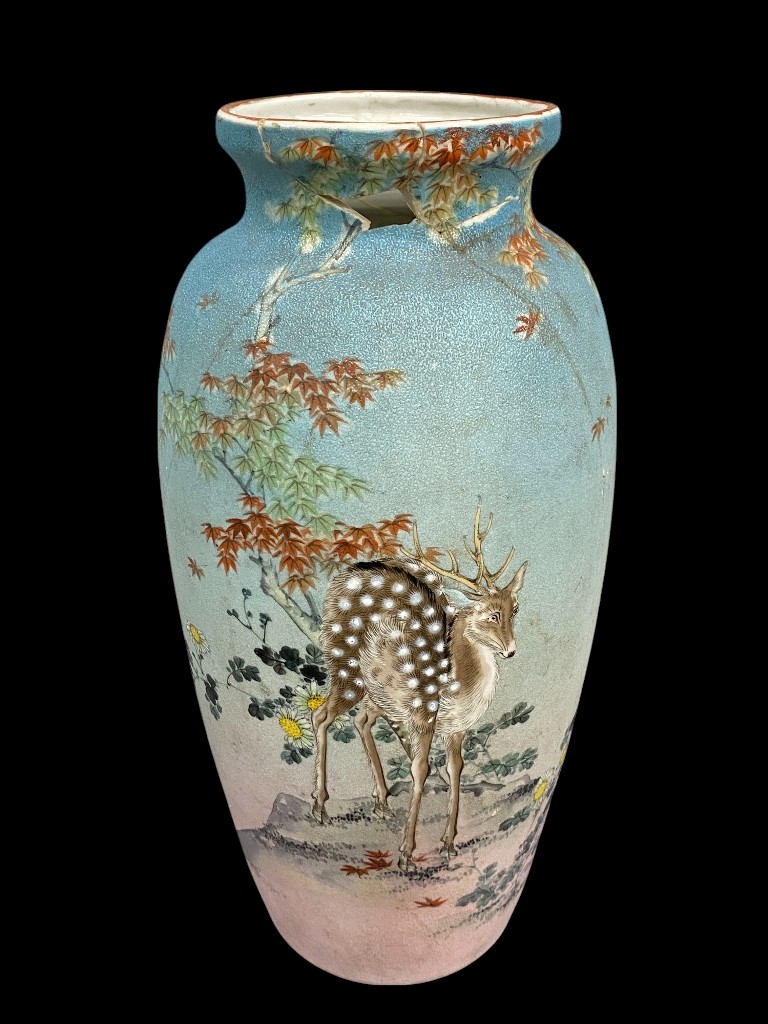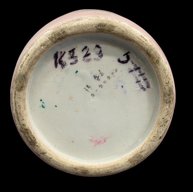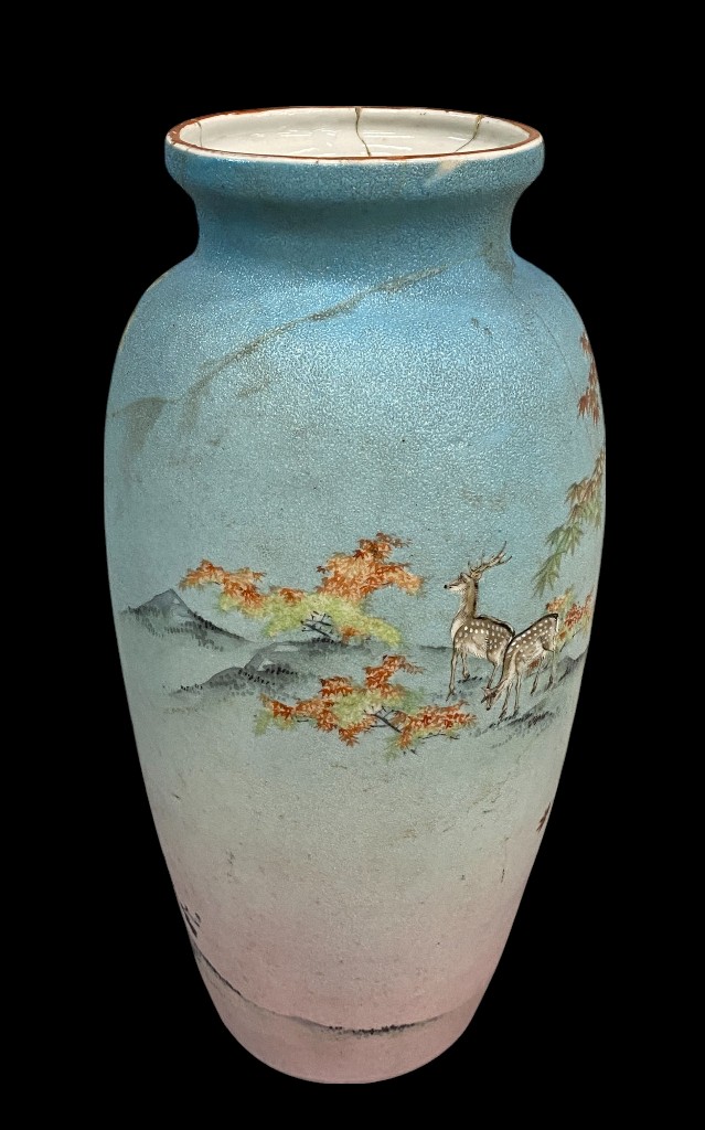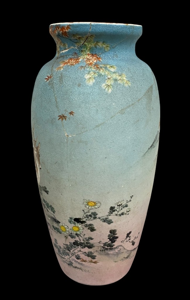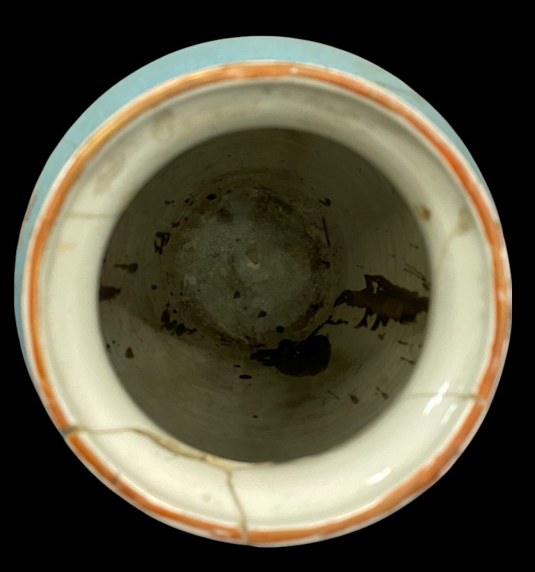 20.sz. eleje. Mázas porcelán erősen sérült, ragasztott, repedt, hiányos. Töréses jelenetre javasolt.