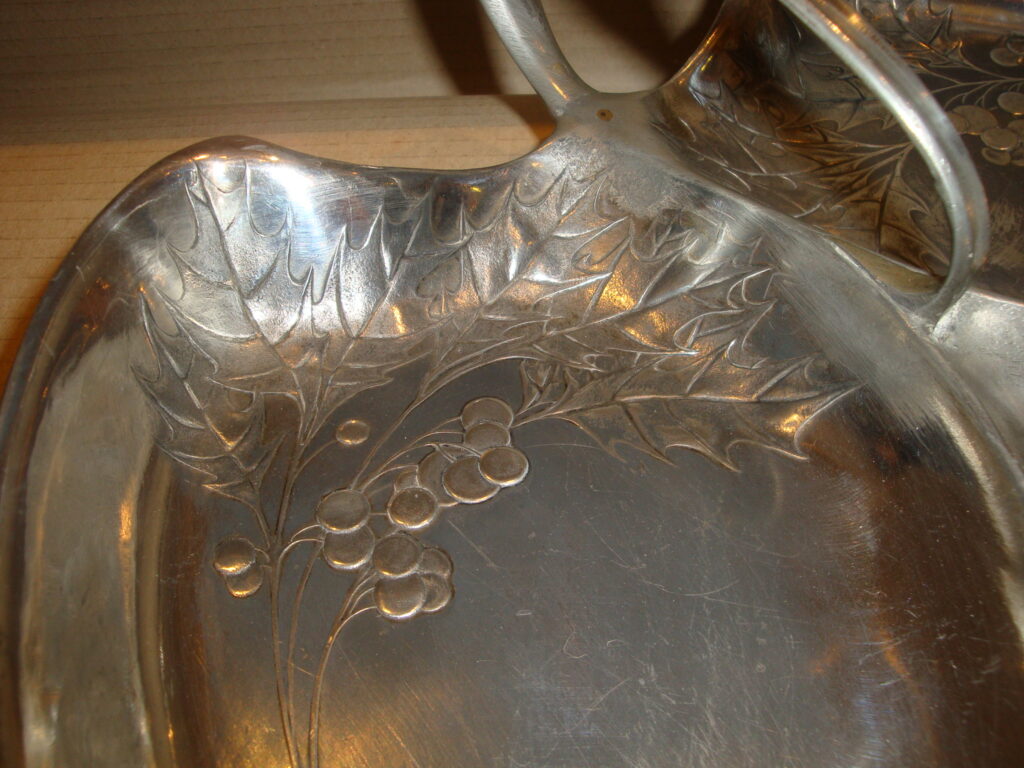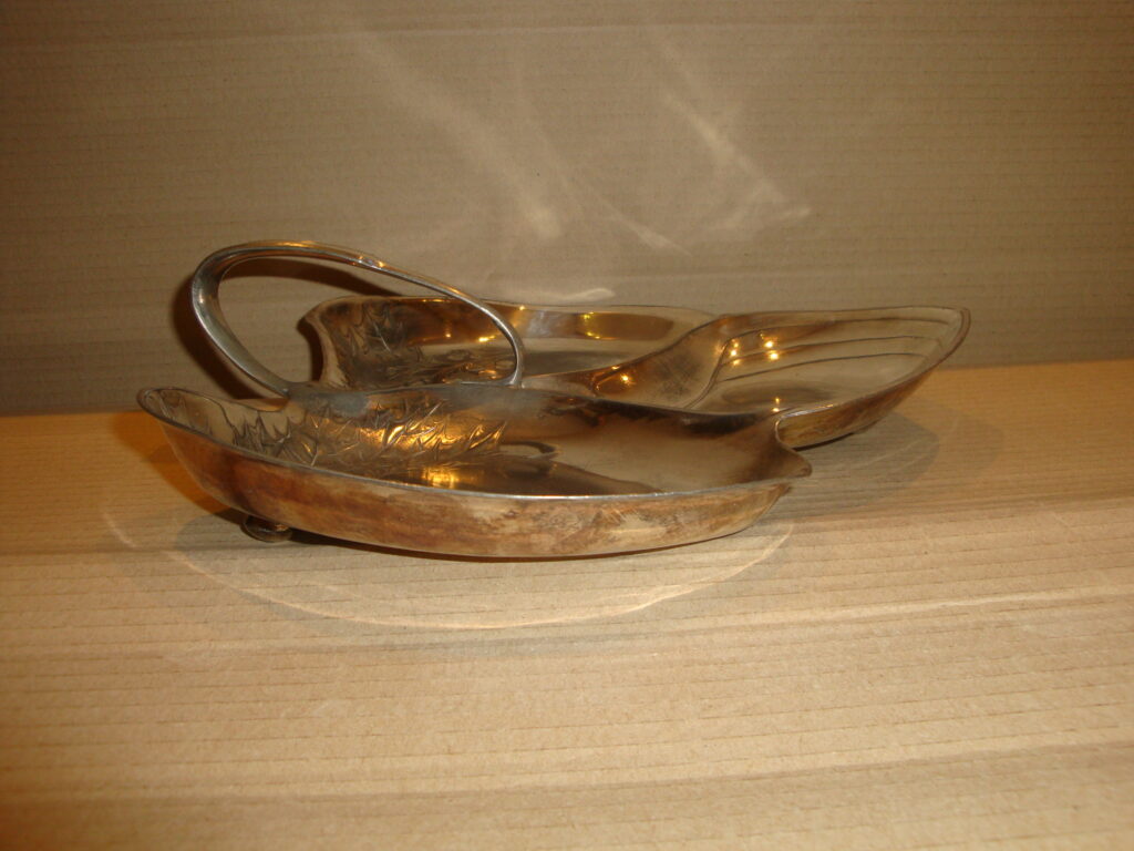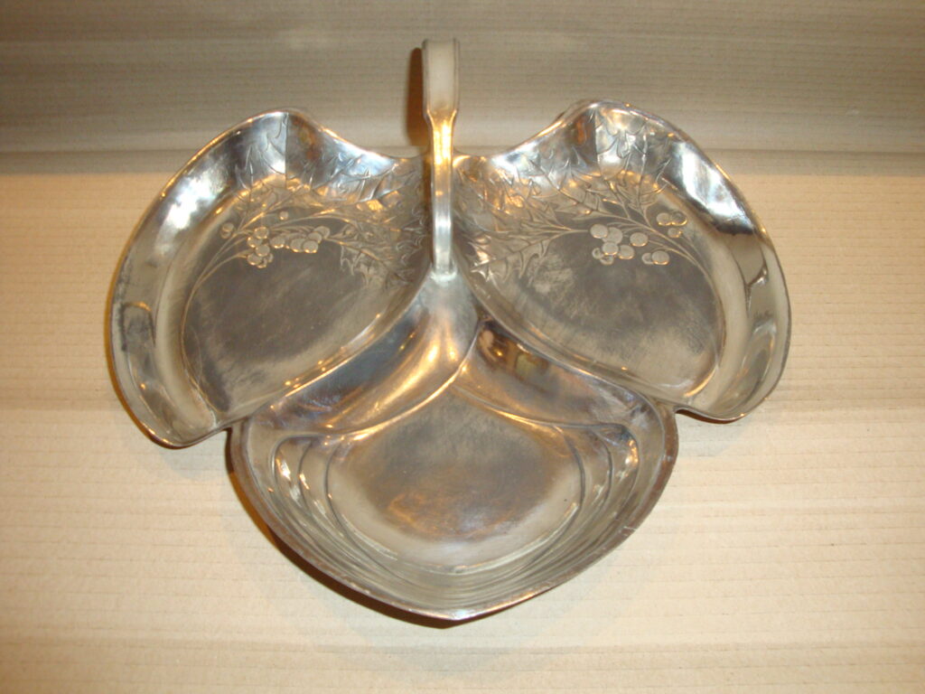Szecessziós levél alakú kínáló: 1900 körüli levél formájú, 3-as tagolású kínáló, tipikusan szecessziós ornamentális díszítéssel, alján cégjelzéssel, ezüstözött kivitelben.