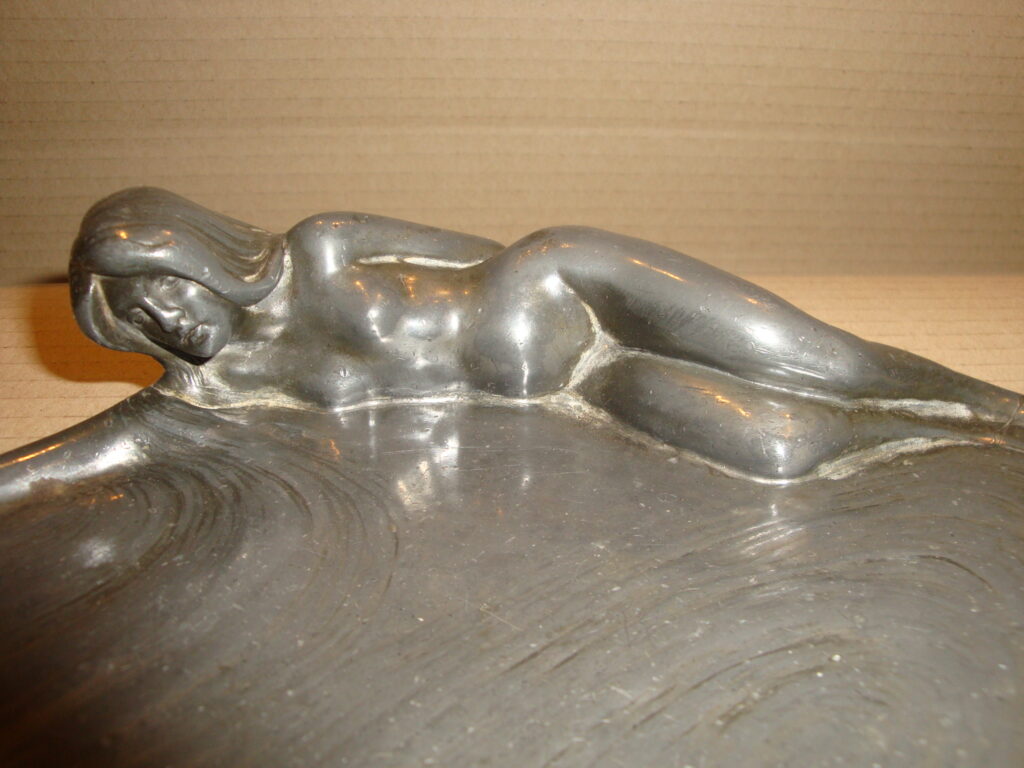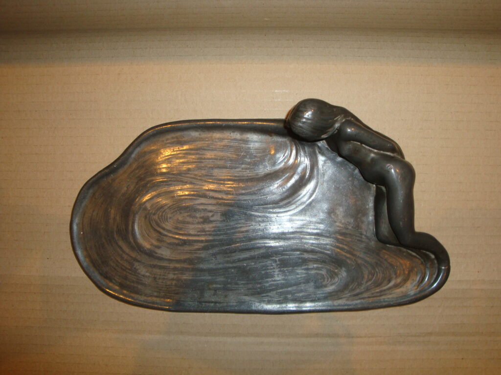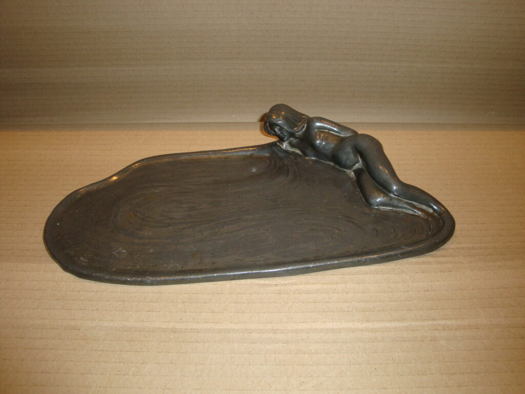 Szecessziós ón figurális névjegytartó: 1900 körüli, meztelen női figurával körülvett kínáló, eredeti, fellelt állapotban. Méret: 4×28×14 cm