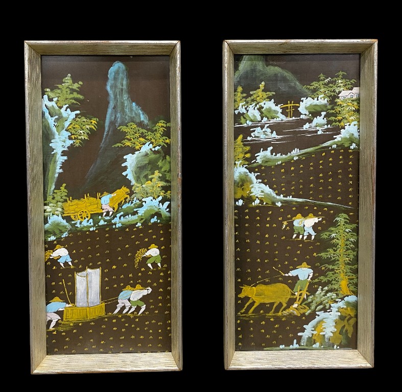 Távol keleti jellegű, mezőgazdasági munkálatokat végző munkásokat ábrázoló kép
