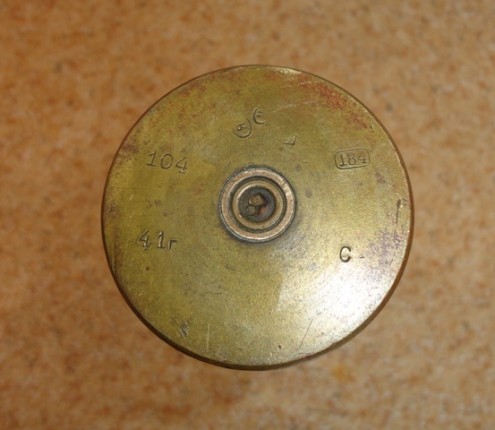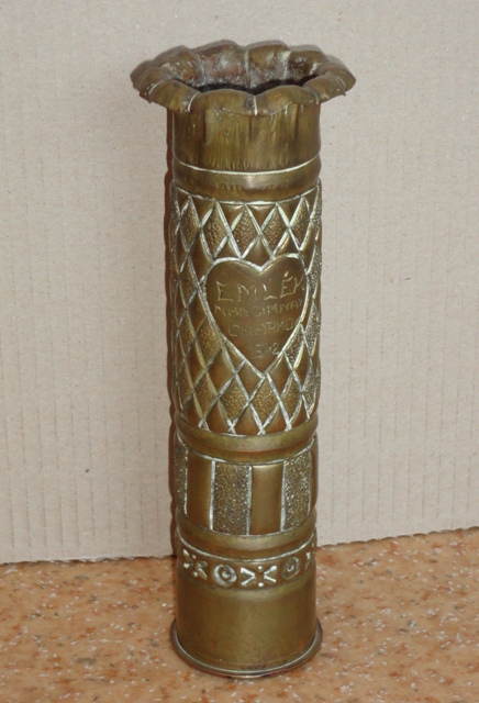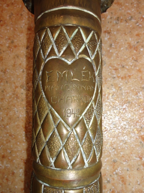 Töltényhüvely váza 2.: Vésett felirata: EMLÉK MANCIMNAK CHARKOV 1942.