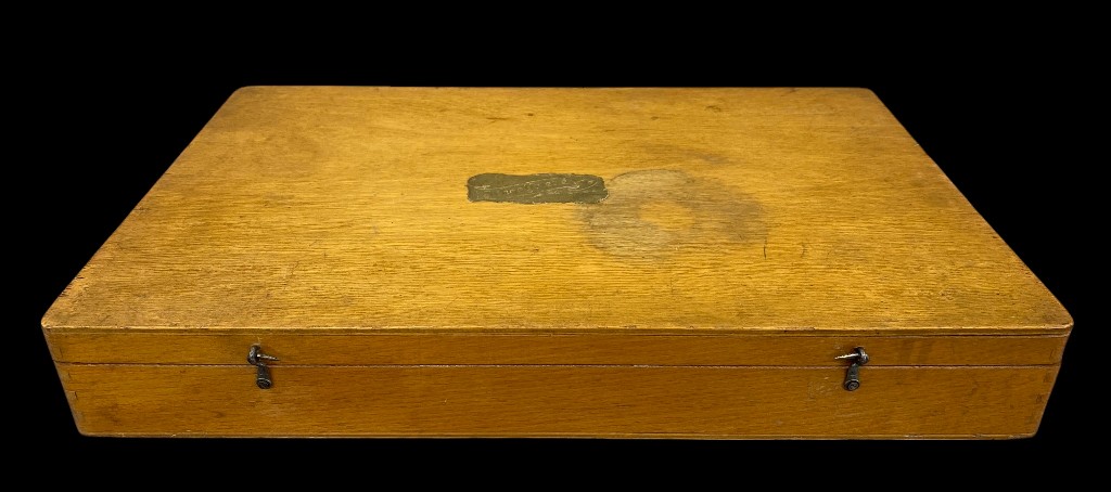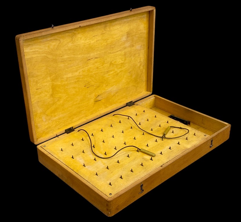 20.sz. közepe. Iskolai fizikai demonstrációs eszköz. A fa dobozban lévő szegek és a vezetékekkel különböző áramköri kapcsolásokat lehetett vele bemutatni vagy gyakorolni. A fém lapon „Schoolfriend” felirat olvasható.
